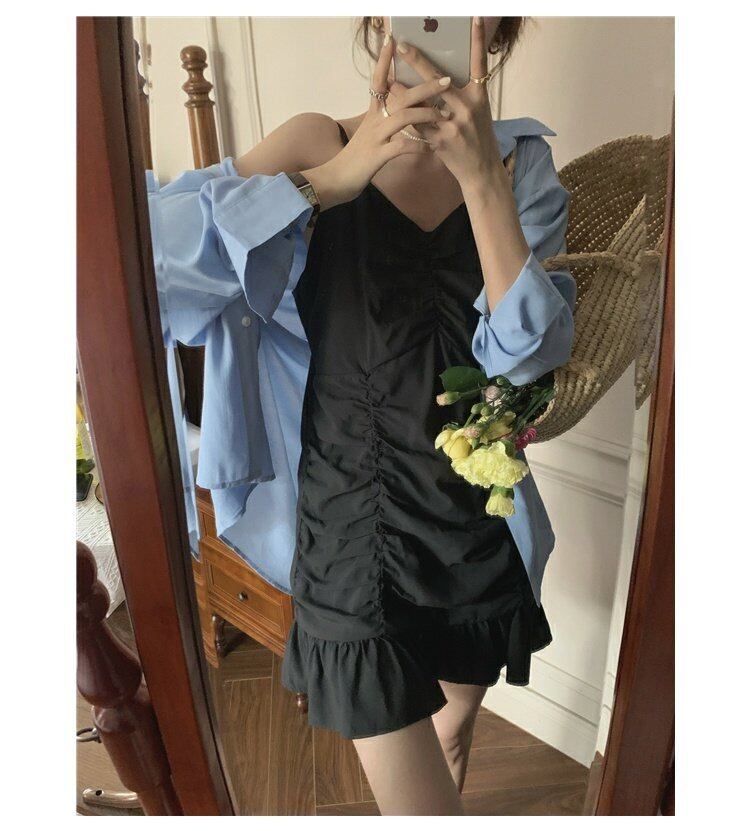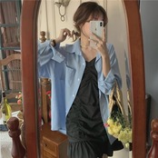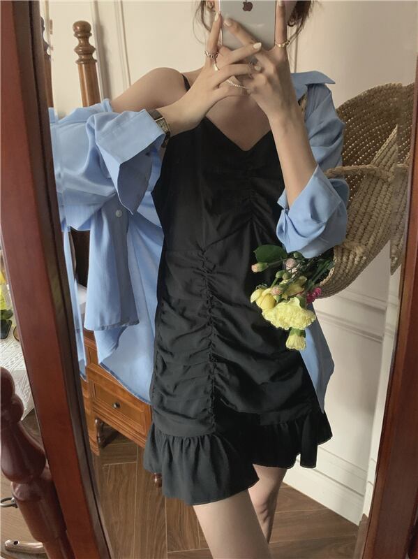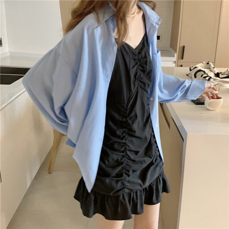 色:青いシャツ,ブラックサスペンダースカート