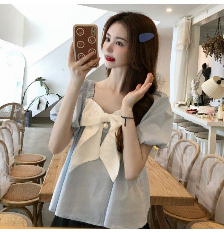 スリーブトップス レディース夏服スタンダードカラーショートシャツ リボン レトロ 夏物 スクウェア コーデ marchs6782821761764