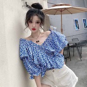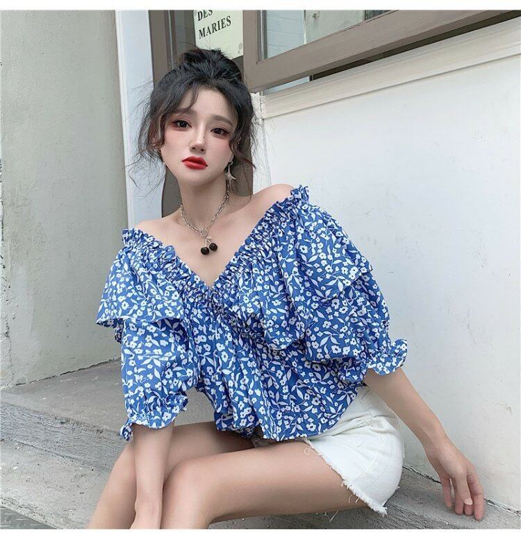 トップス 夏服Vネックグリーンフローラルシャツ 夏物 花柄 コーデ marchs6748249077957