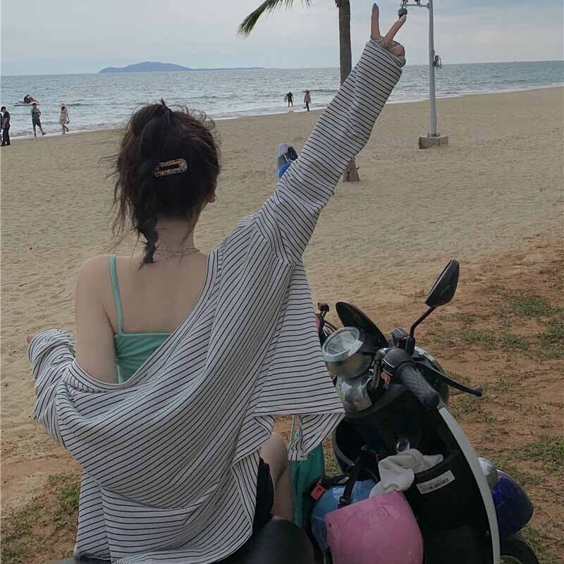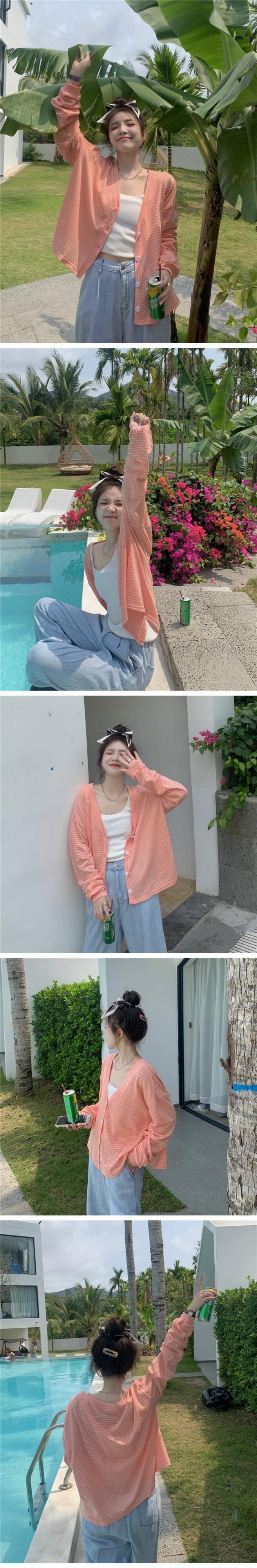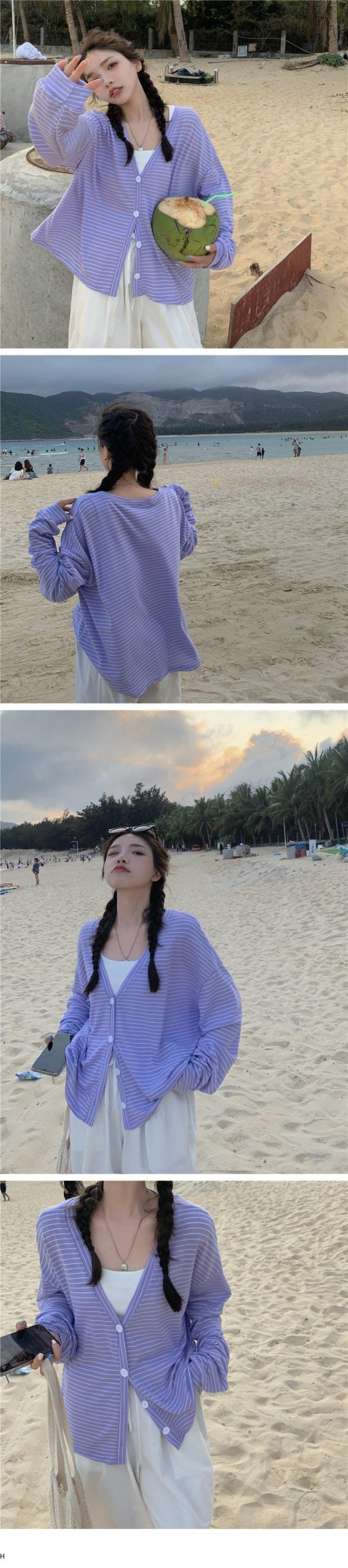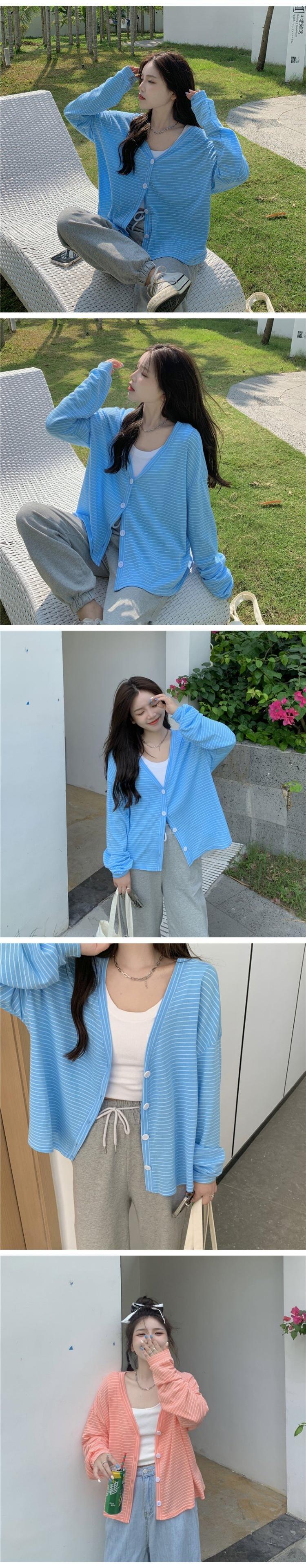 夏服韓国ファッションVネックルーズストライプカーディガンブルーコート レディース ロング 夏物 スタイル 長袖 コーデ marchs672416043910