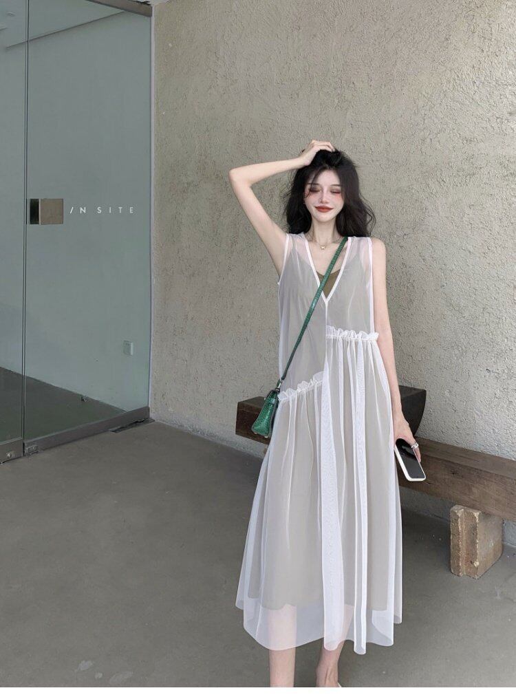 Vネックワンピース夏服ホワイトスカート 夏物 ミドル丈 コーデ marchs6766710569978