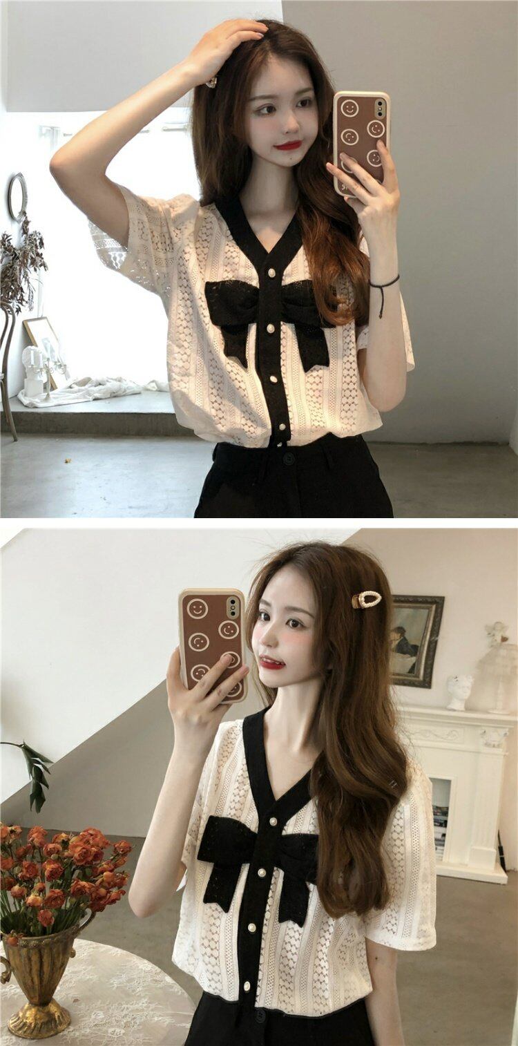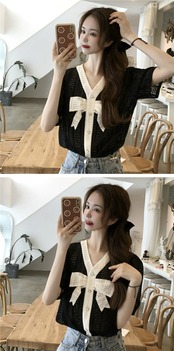 スタンダードカラーリボンレースシャツ レディース夏服ルーズ薄手 レトロ 夏物 コーデ marchs671314784801