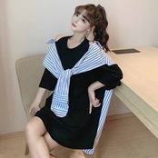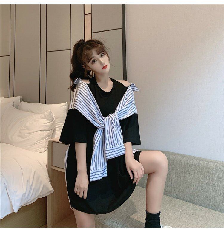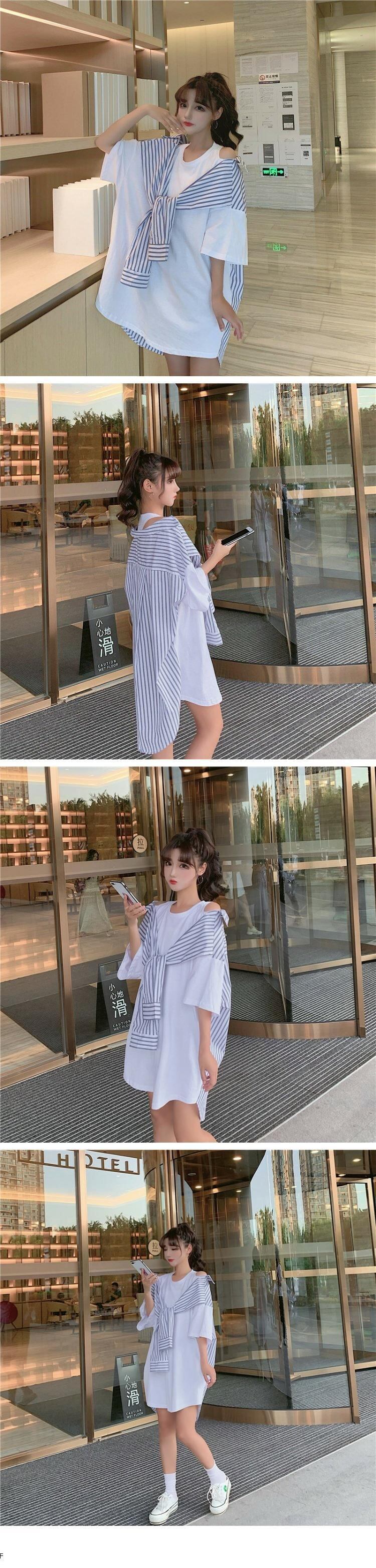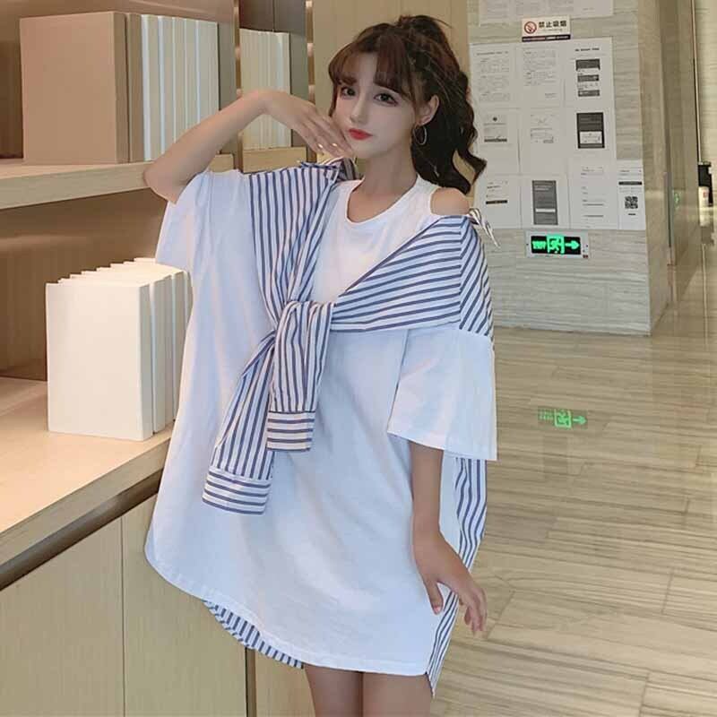 夏服ストライプショールスリーブTシャツルーズトップス 夏物 オフショルダー ステッチ ミドル丈 コーデ marchs6737979506591