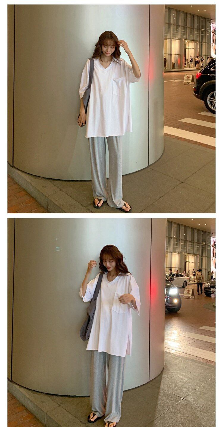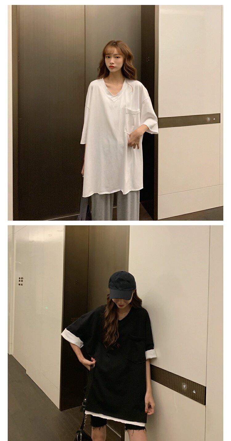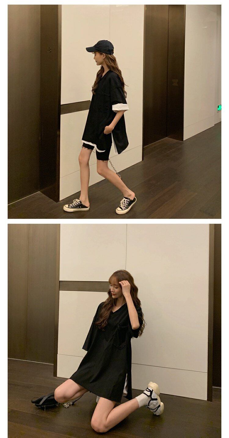 夏服スタイルVネックルーズサイドスリットロングTシャツレディース ピンク 大きめサイズ 夏物 コーデ marchs6750977782828