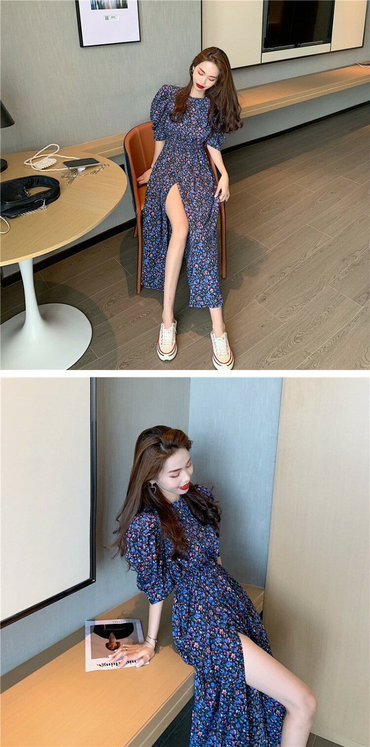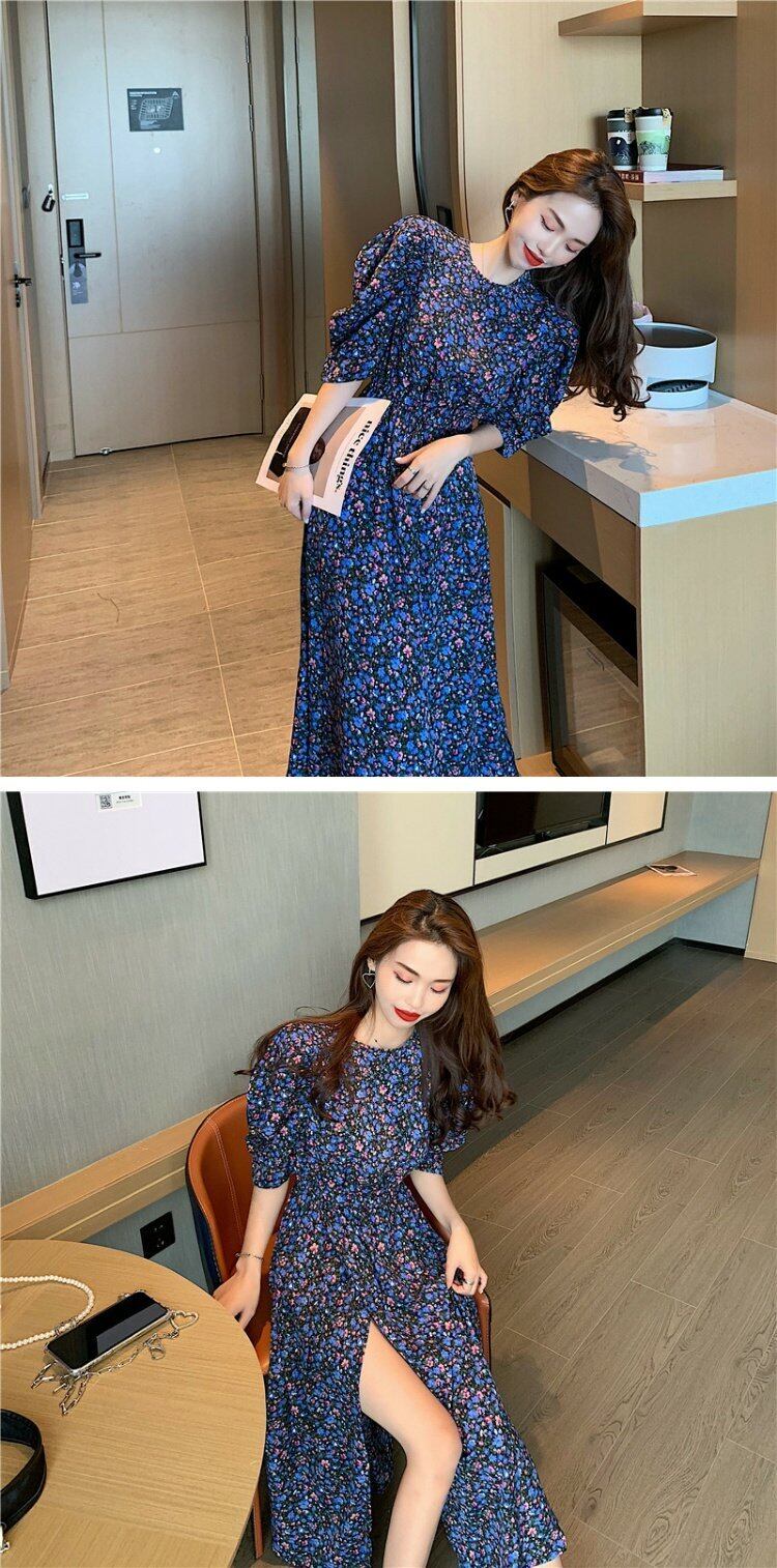 フローラルワンピース夏服韓国ファッションラウンドネックウェストロングスカート 夏物 花柄 Oネック ウエスト コーデ marchs6789736978838