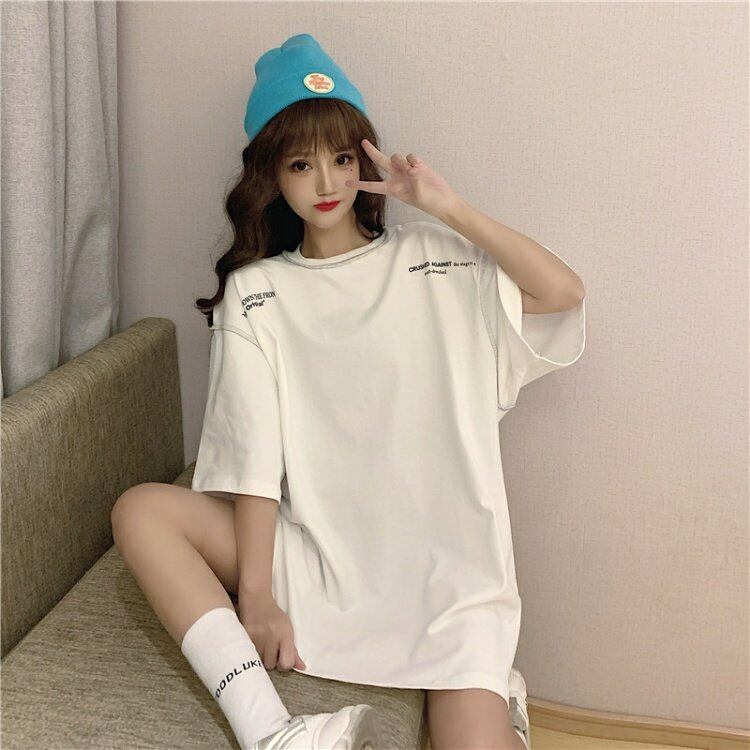 夏服韓国ファッションルーズホワイトTシャツレディース 大きめサイズ 夏物 ボーイズ スタイル ミドル丈 コーデ marchs6767889776501