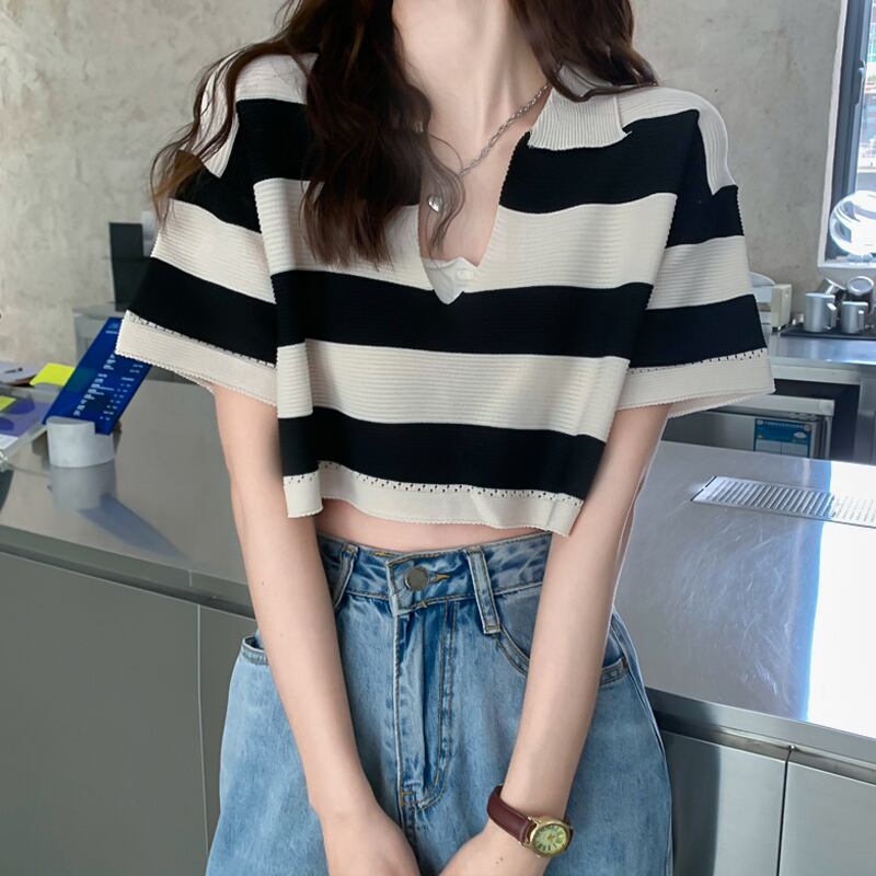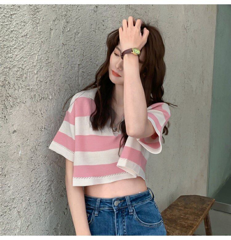 夏服韓国ファッションショートルーズストライプVネックシャツ Tシャツセーター レディース 大人ガーリー スウィート キュート カジュアル 夏物 スタイル コーデ marchs6752780063804