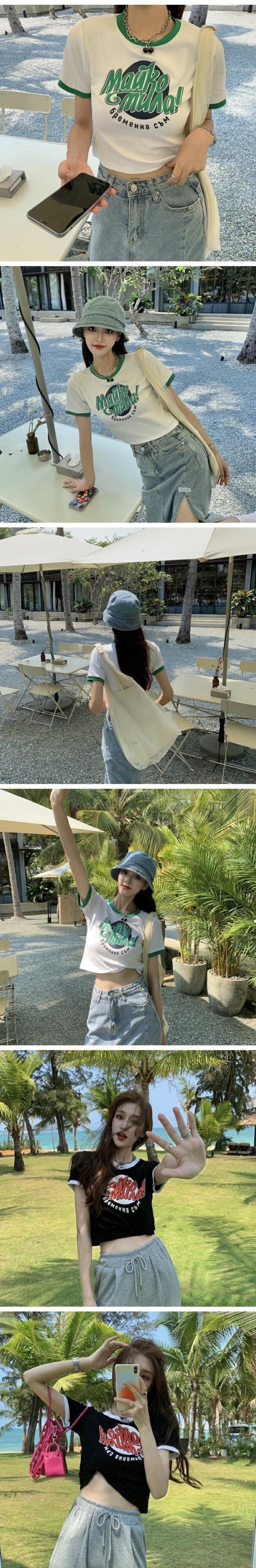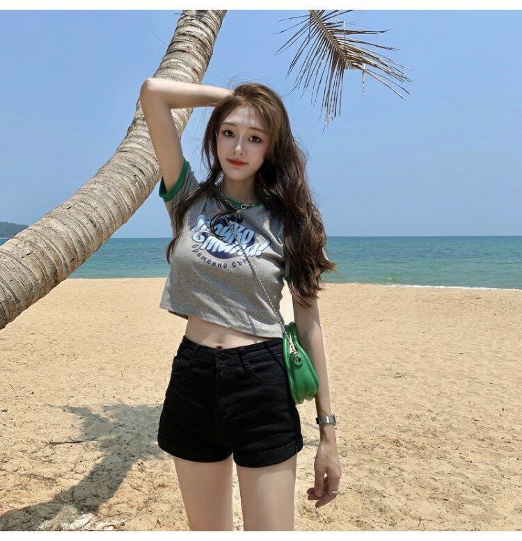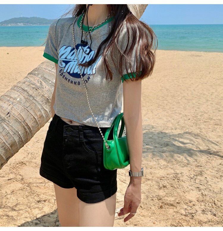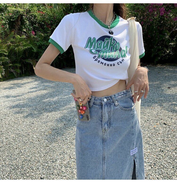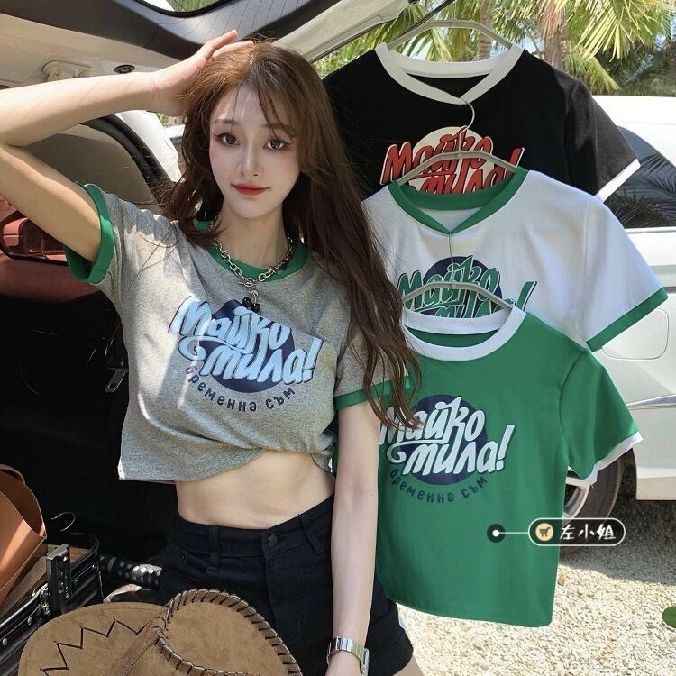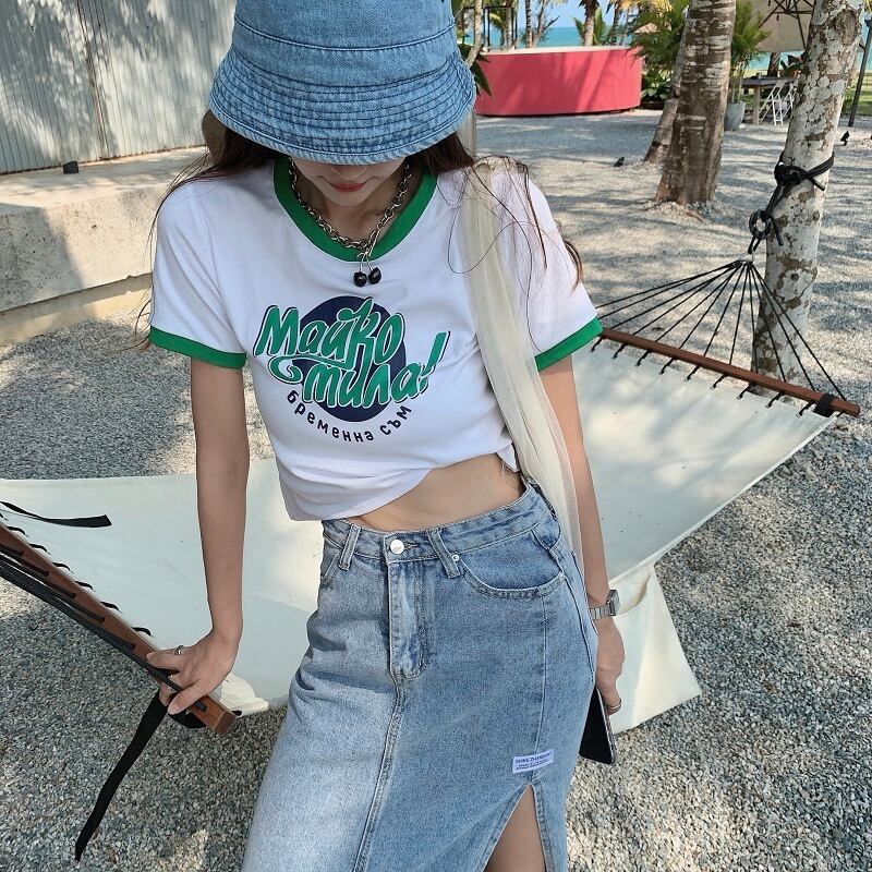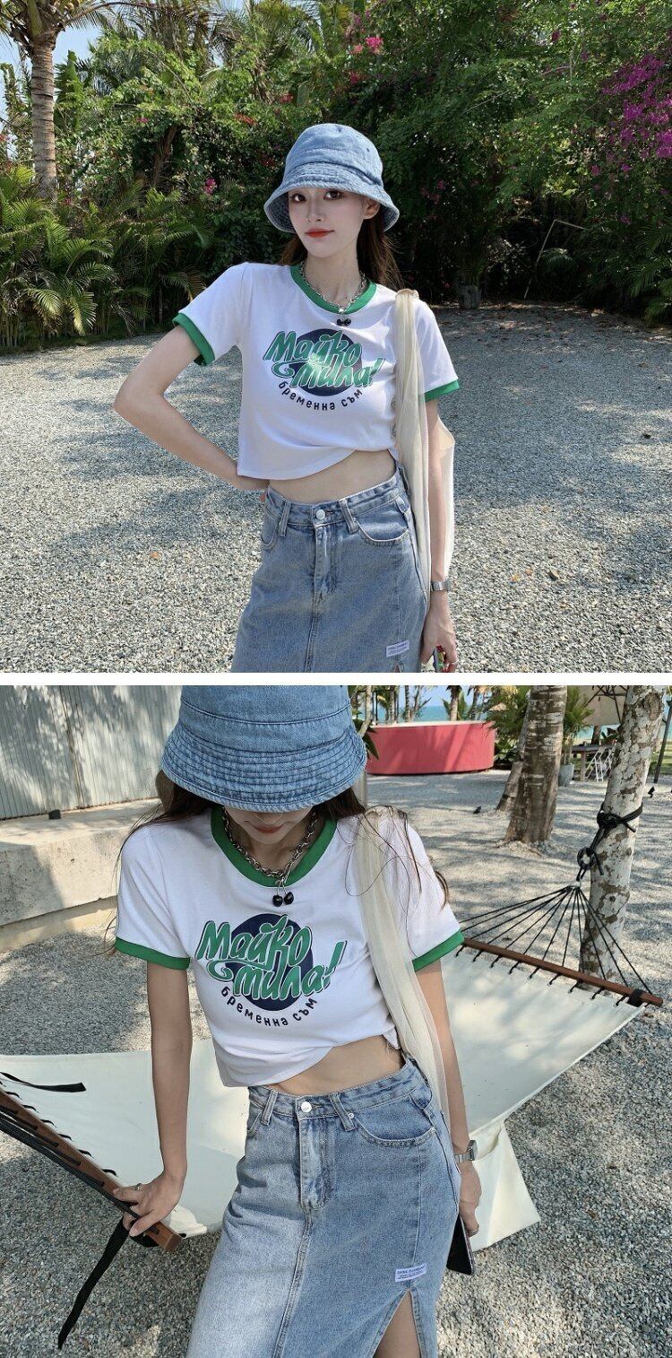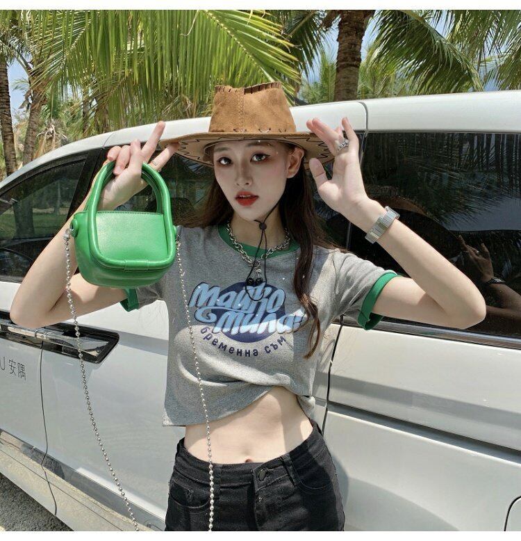 カラーハイウェストウェストショートトップス 夏服プリントグリーンTシャツレディース 大人ガーリー スウィート キュート カジュアル 夏物 ウエスト コーデ marchs679240211326