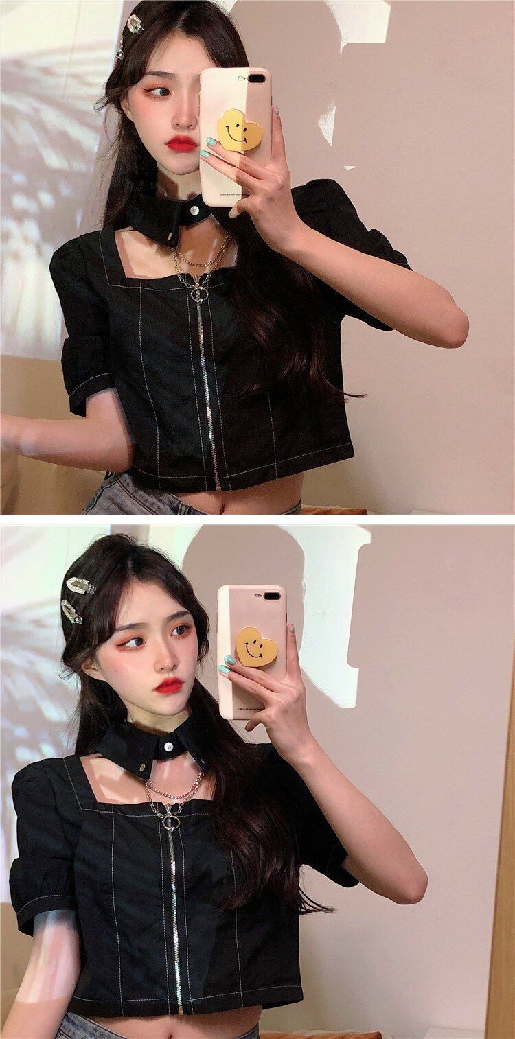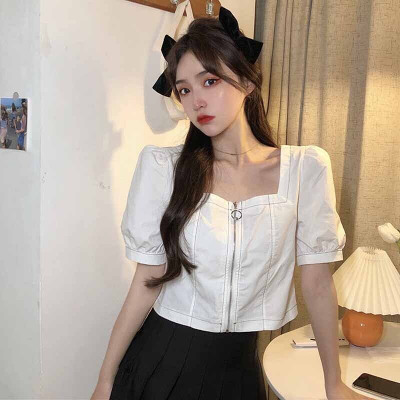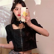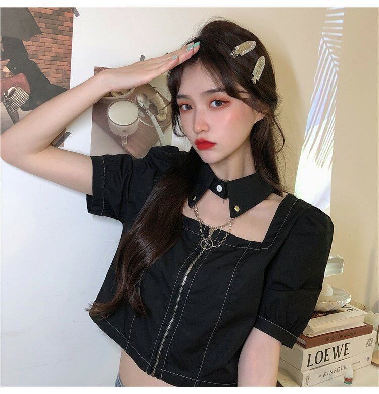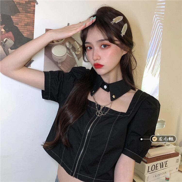 ブラウス レディース夏服スタイルクロップドショートハイウェストウェストブラックシャツ 大人ガーリー スウィート キュート カジュアル 夏物 スクウェア ウエスト コーデ marchs6745235796081