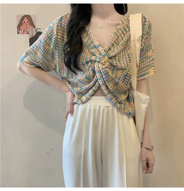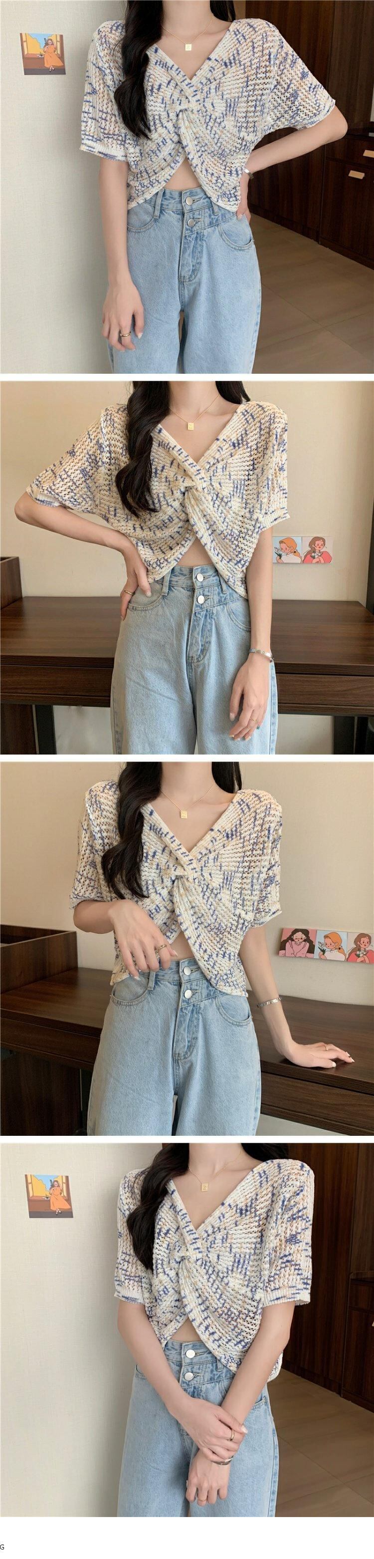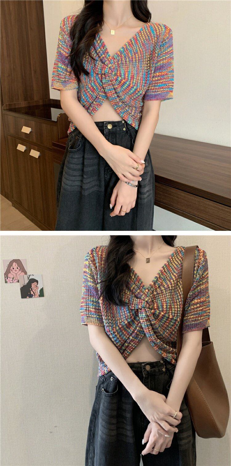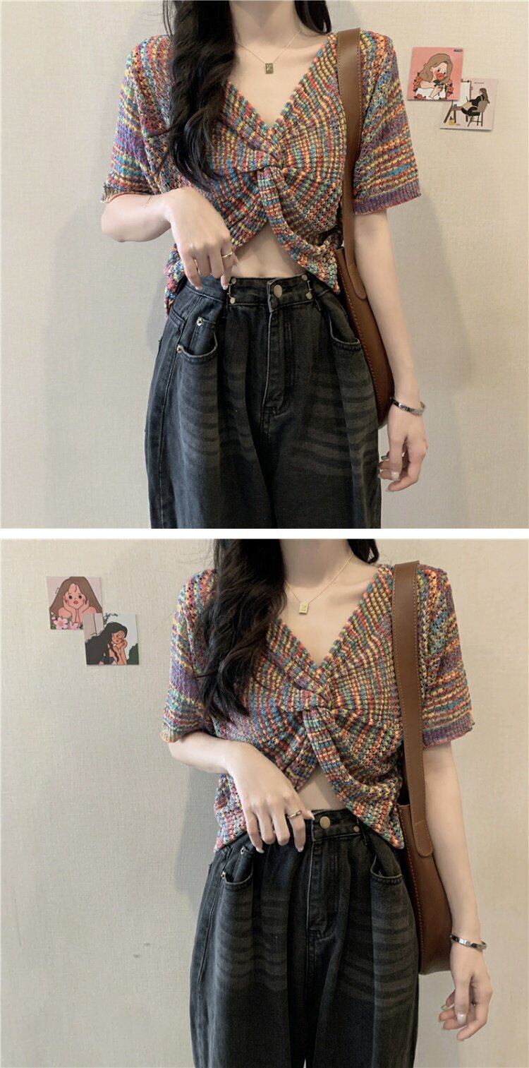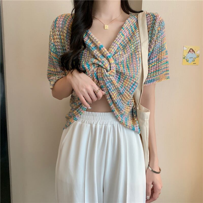 ショートニットトップス 夏服スタイルVネック薄手 大人ガーリー スウィート キュート カジュアル 夏物 コーデ marchs6746945147905