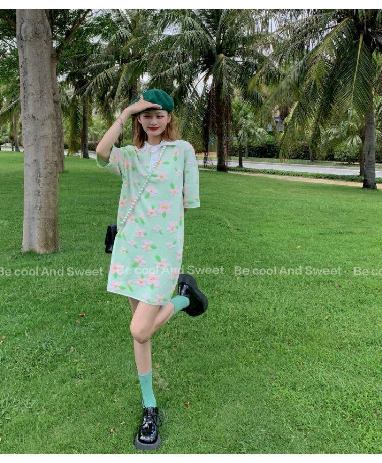 韓国ファッションワンピースレディース夏服半袖スリーブカラースカート ショート ハーフスリーブ 大人ガーリー スウィート キュート カジュアル 夏物 フラワーデザイン コーデ marchs6728794537175