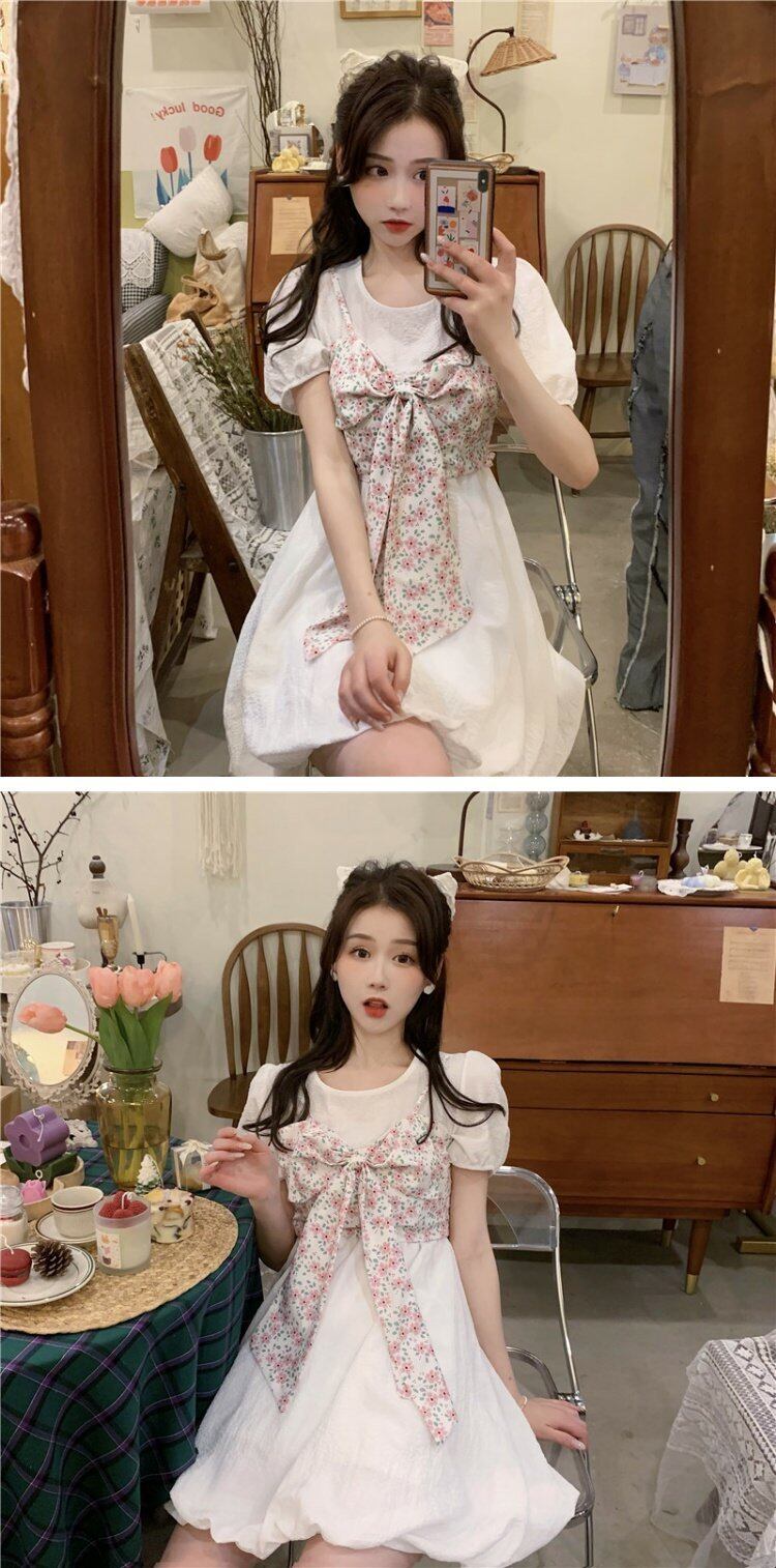 韓国ファッションスタイルスカート レディースパフスリーブスリーブウェストワンピースフローラル夏服 大人ガーリー スウィート キュート カジュアル 夏物 花柄 ウエスト コーデ marchs6780572243861