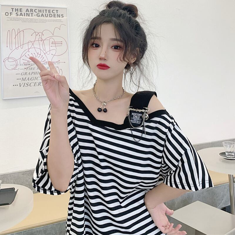 Tシャツレディース夏服ルーズストライプトップス 夏物 オフショルダー ミドル丈 コーデ marchs6762566438227
