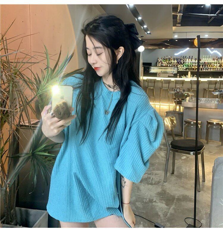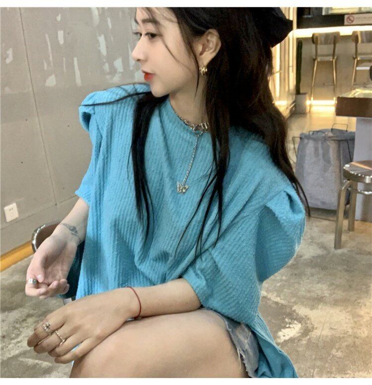 夏服ルーズトップス 韓国ファッションスタイルスリーブブルーTシャツ 夏物 コーデ marchs6773208919777