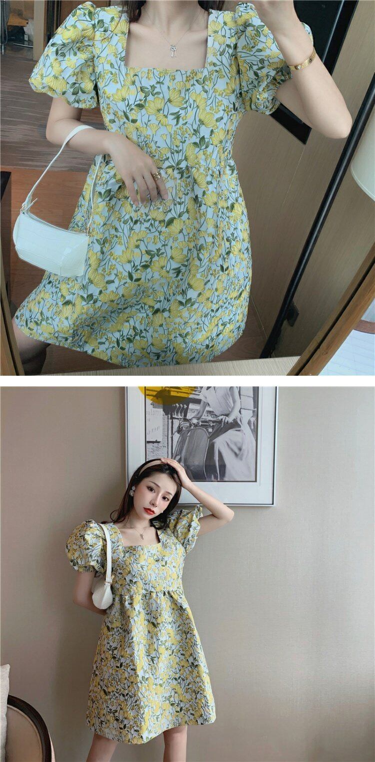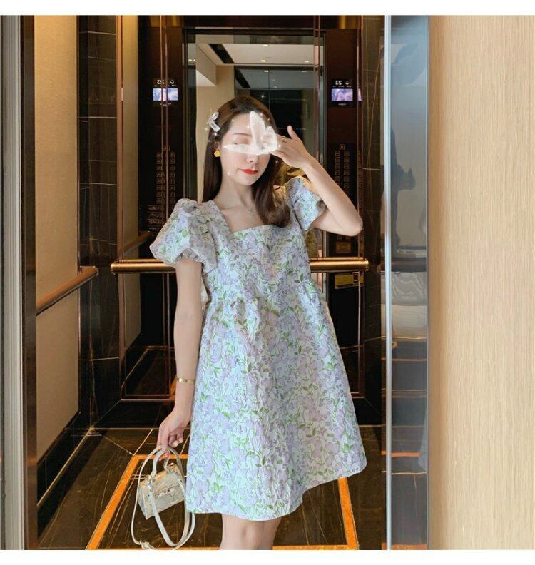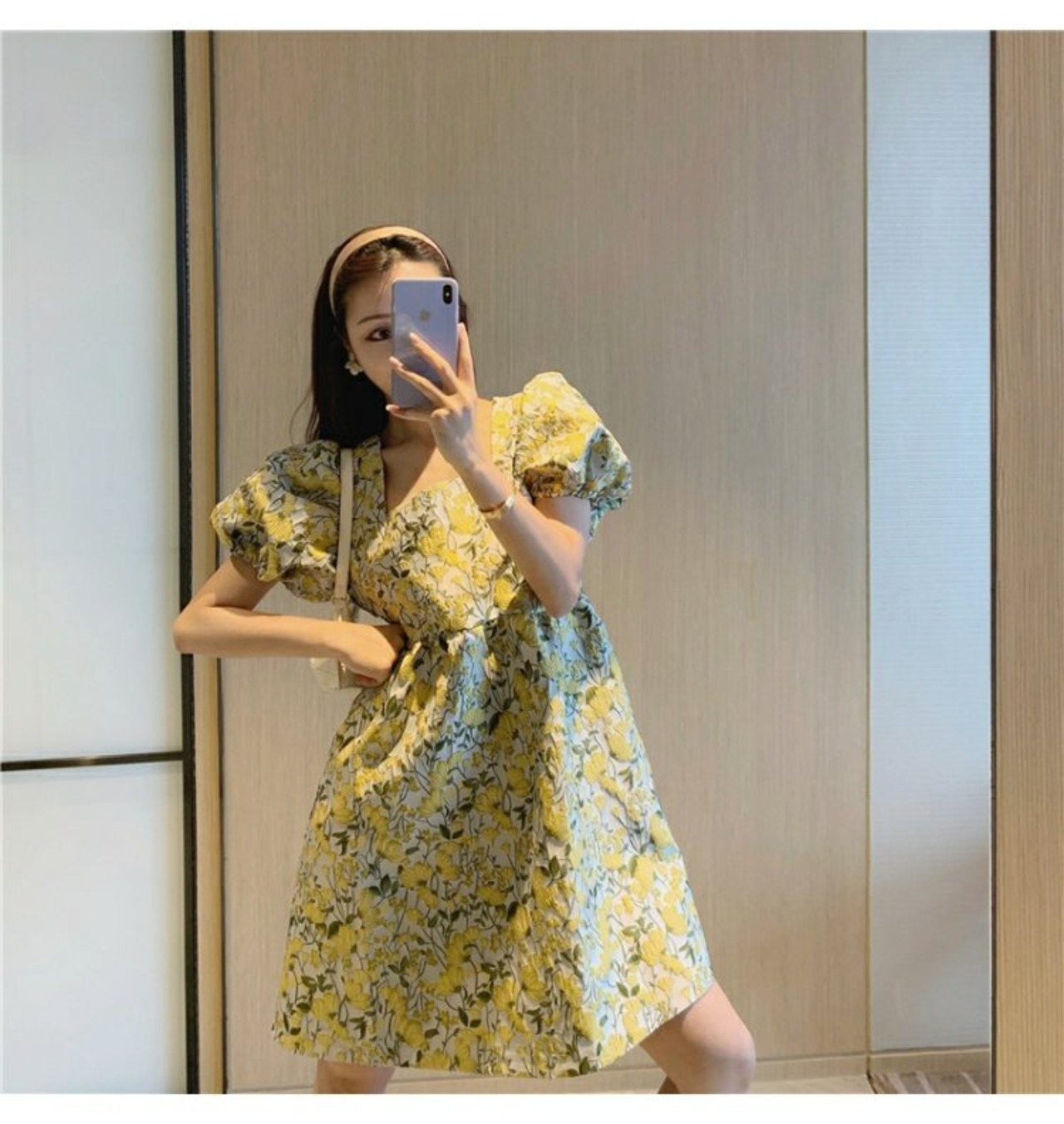 夏服スタンダードフローラルカラーハイウェストウェスト薄手スリーブプリントワンピースレディース レトロ 夏物 花柄 スクウェア ウエスト コーデ marchs6713499197161