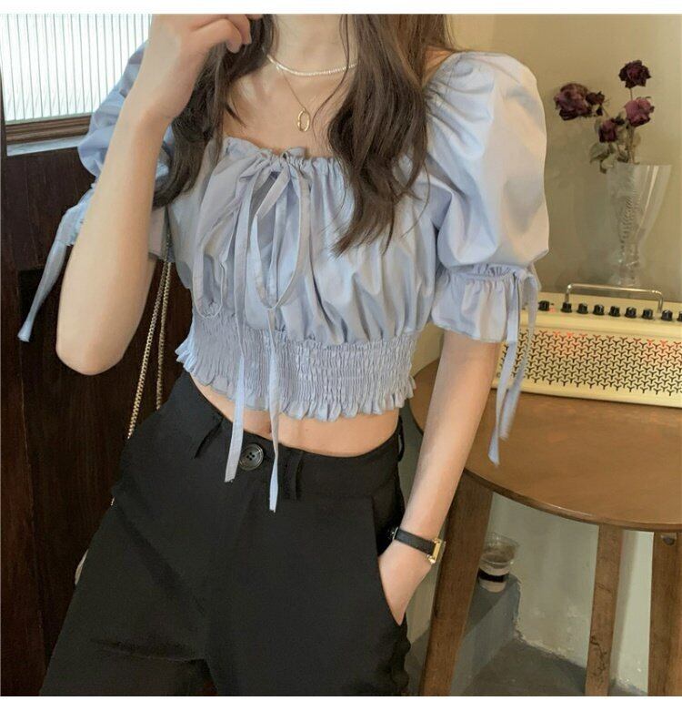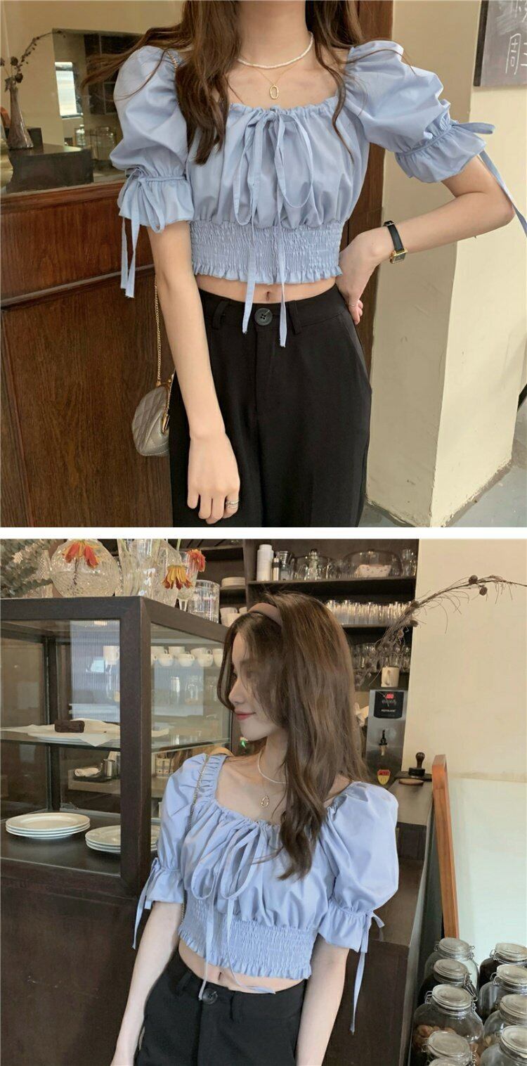 韓国ファッションカラーシャツ レディース夏服ハイウェストウェストクロップドショートホワイトトップス 夏物 スクウェア スタイル ウエスト コーデ marchs672997995378