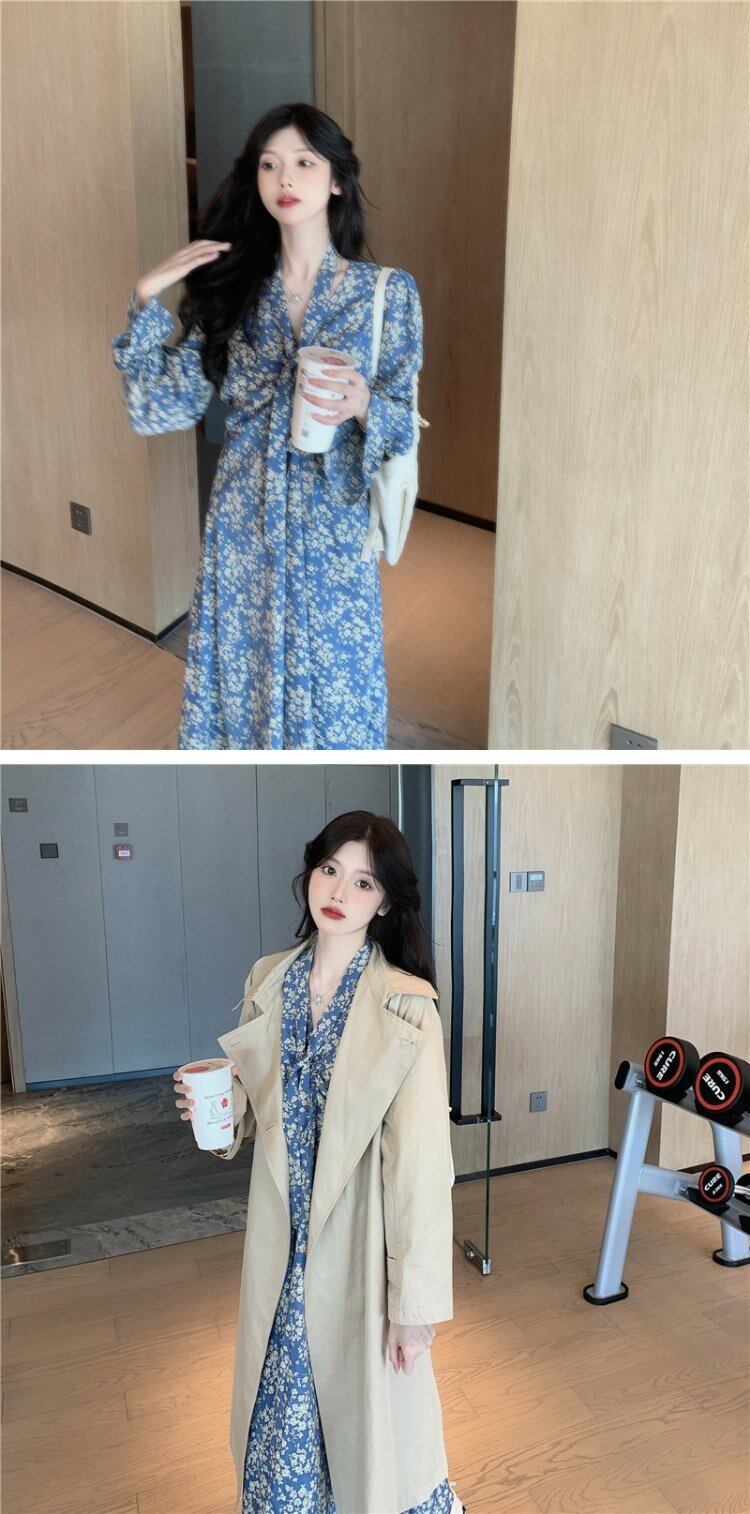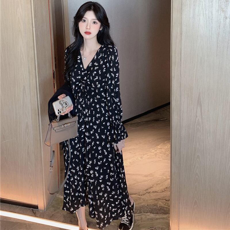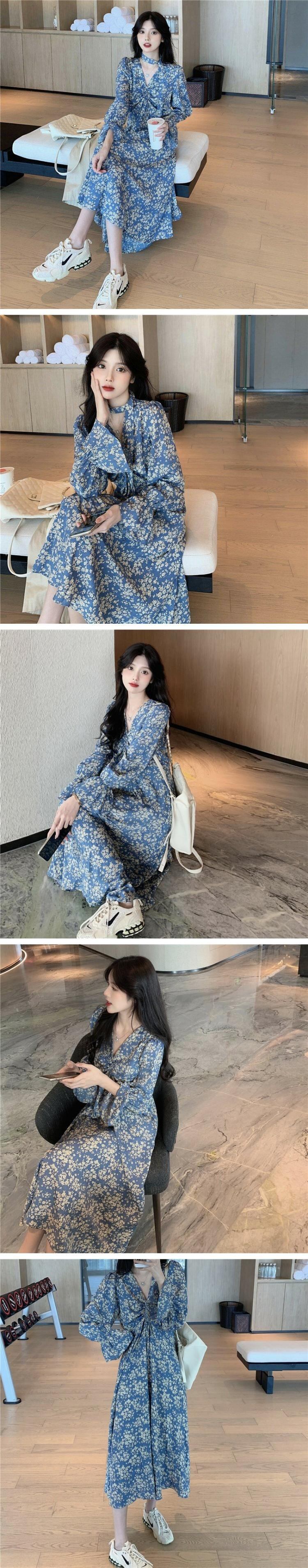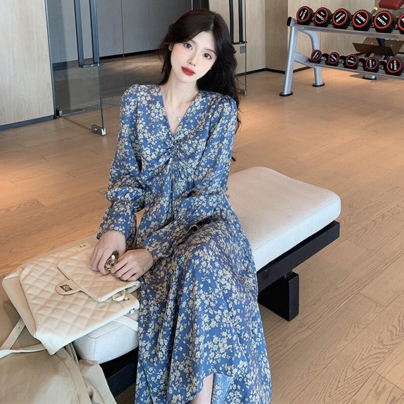 フローラルワンピースレディーススプリングスタイル韓国ファッションスタンダードVネックウェストスリーブロングスカート レトロ 春物 花柄 ウエスト コーデ marchs6721308598070