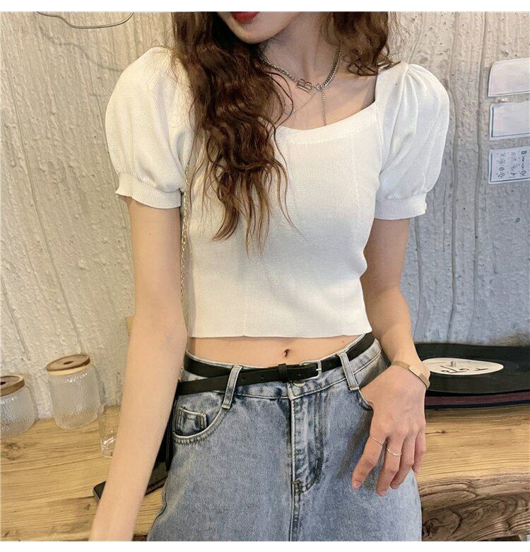 スリーブニットショートTシャツレディース夏服韓国ファッション薄手トップス 夏物 スクウェア スタイル コーデ marchs67409388046