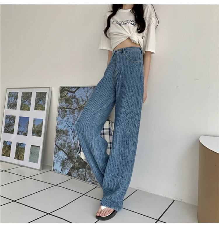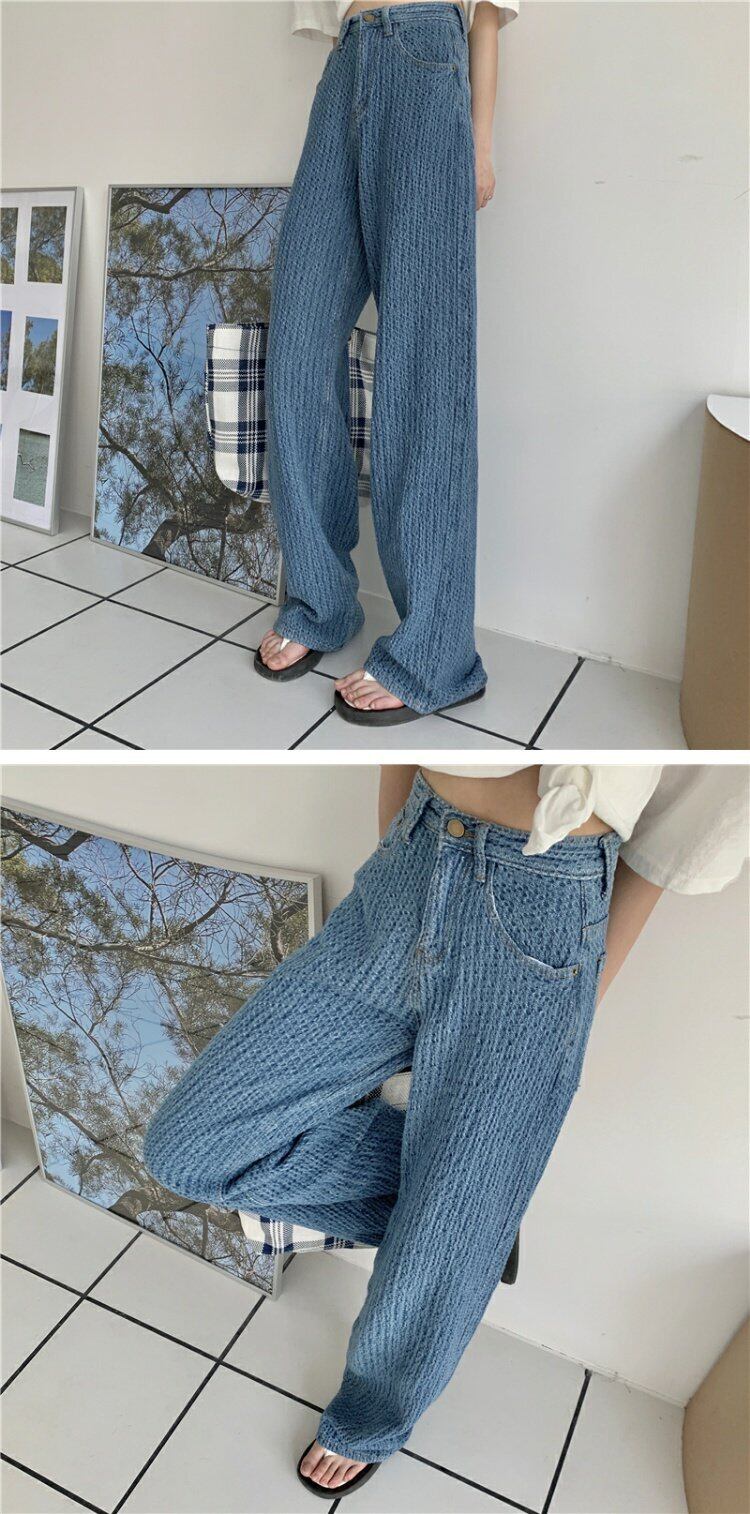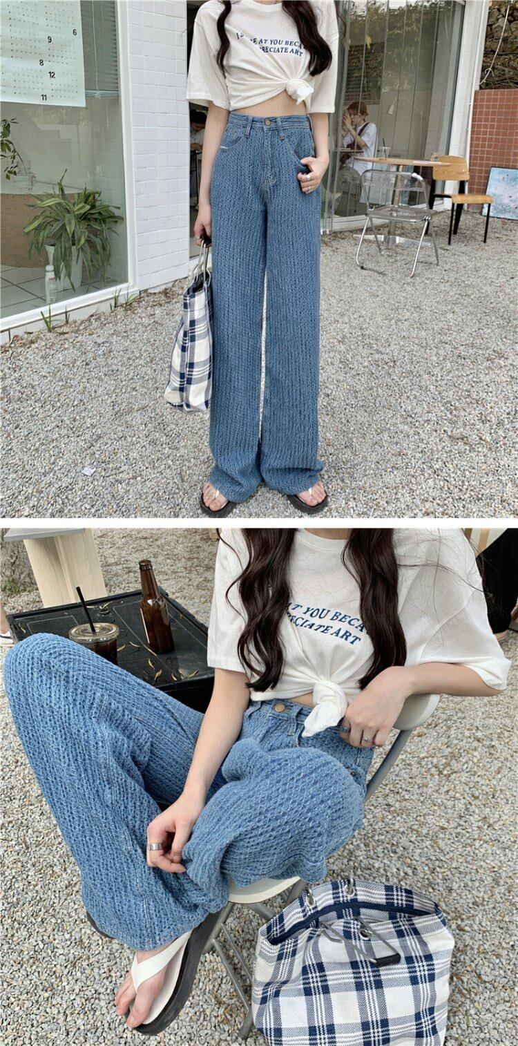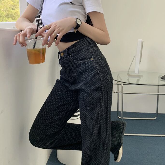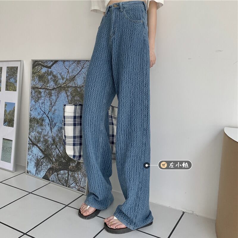 ジーンズ 夏服ルーズハイウェストブルー格子柄パンツ 夏物 ウエスト コーデ marchs6783926659294
