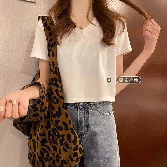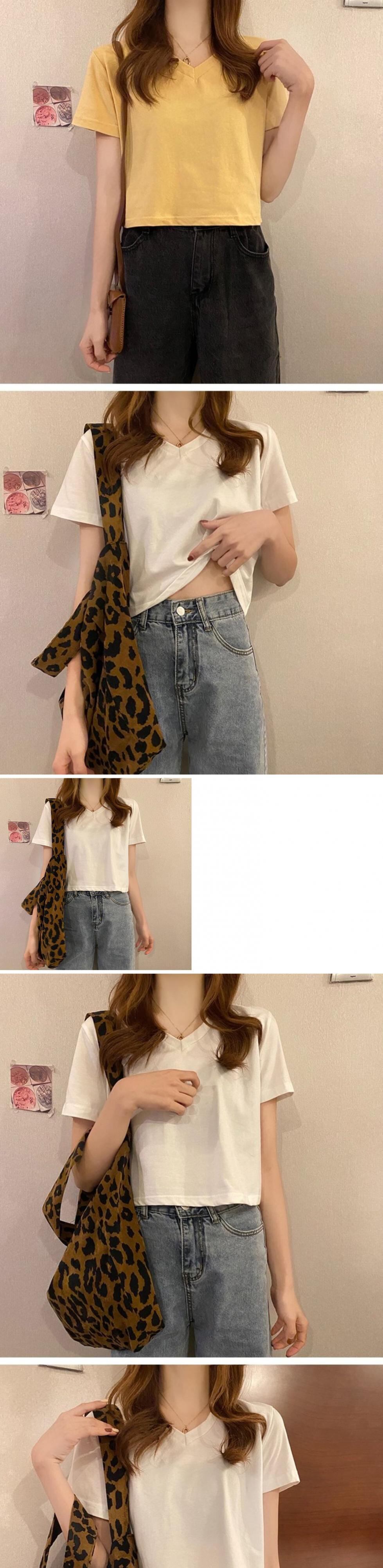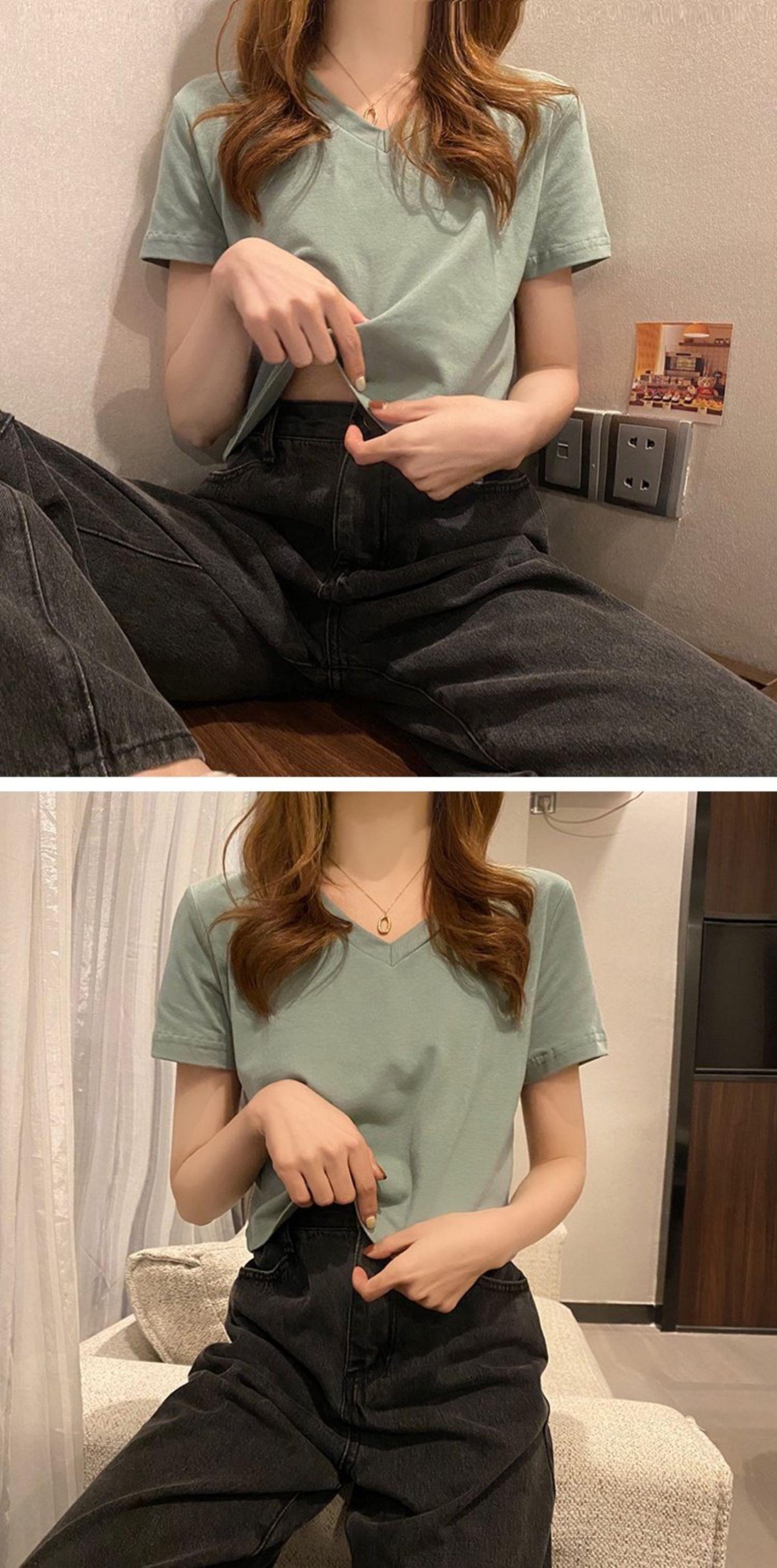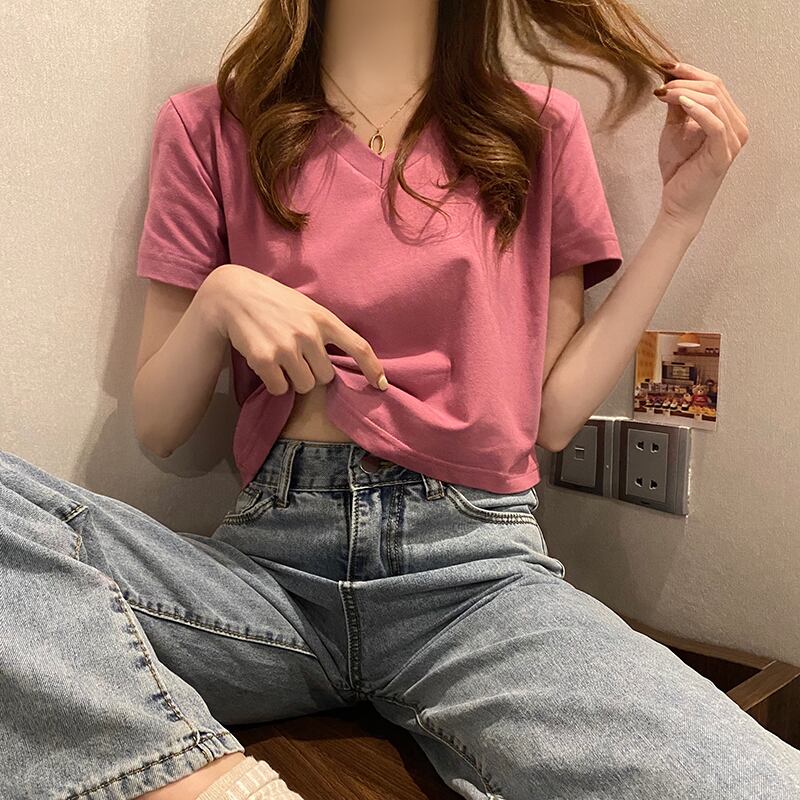 夏服韓国ファッショントレンドスタンダードスタイルルーズVネックTシャツレディースソリッド カラー薄手ゆったりトップス レトロ 夏物 ソリッドカラー コーデ marchs6710478502311