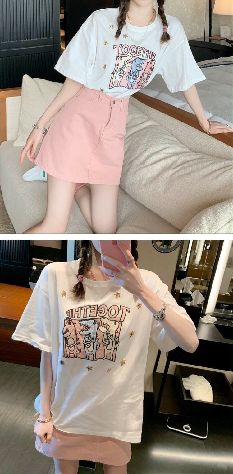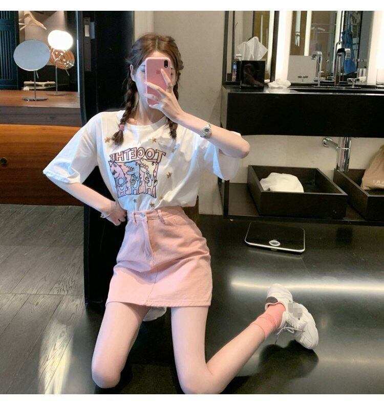 色:ベリーTシャツ,白いTシャツ,ピンクデニムスカート