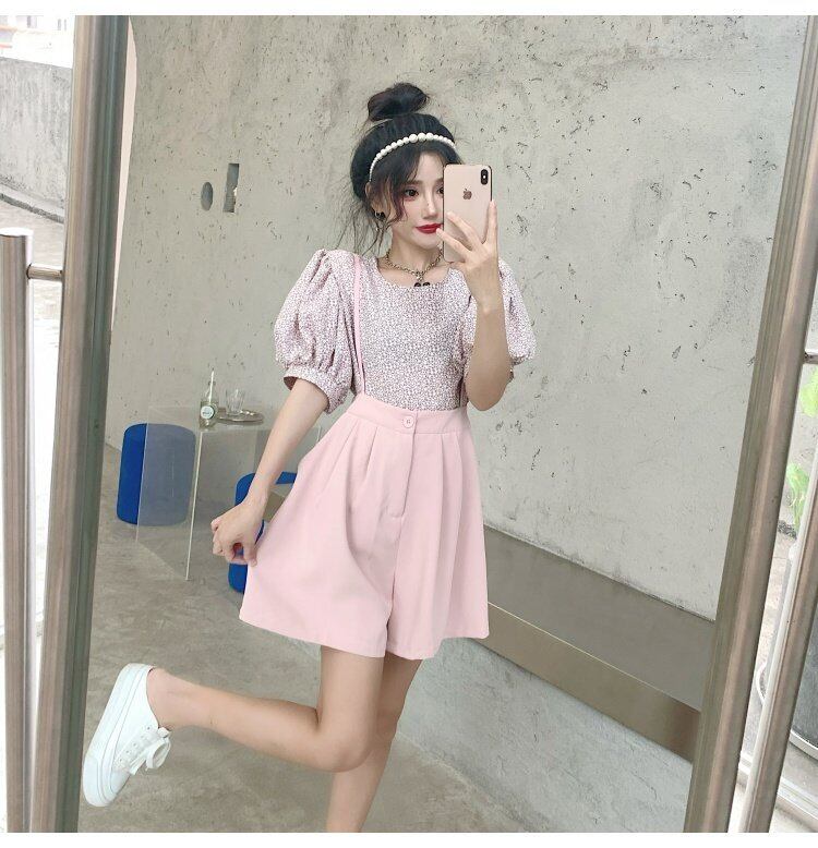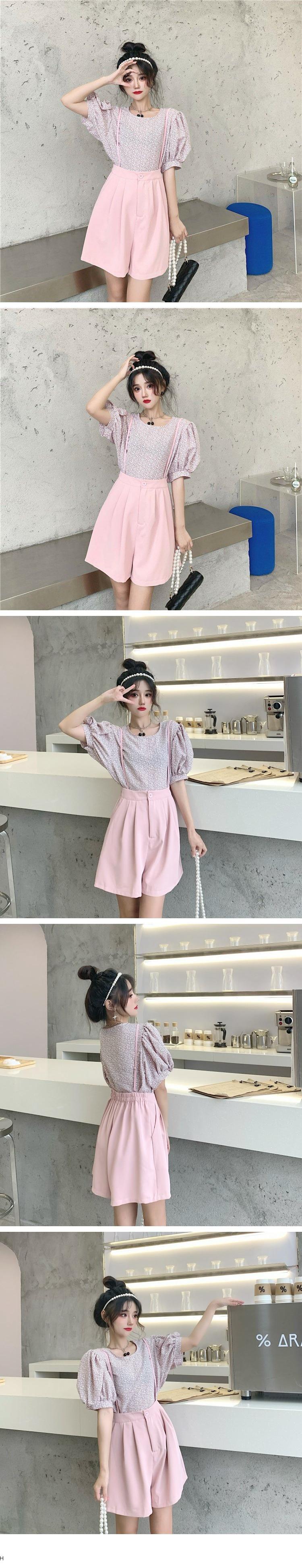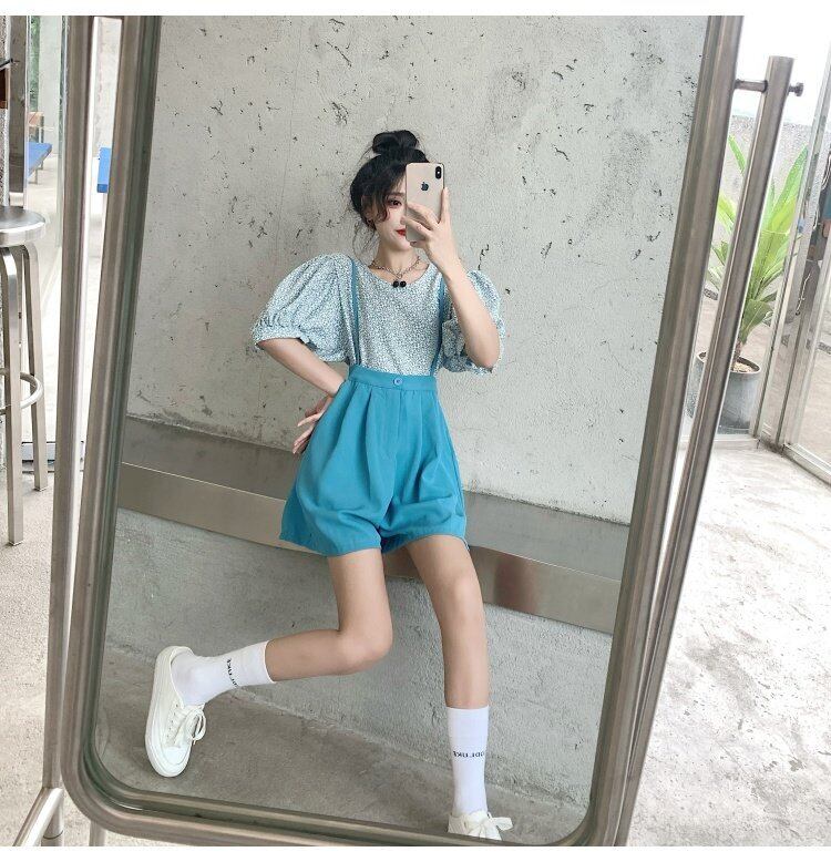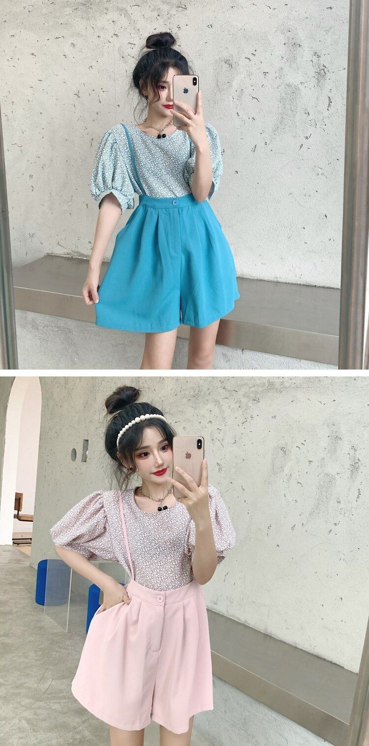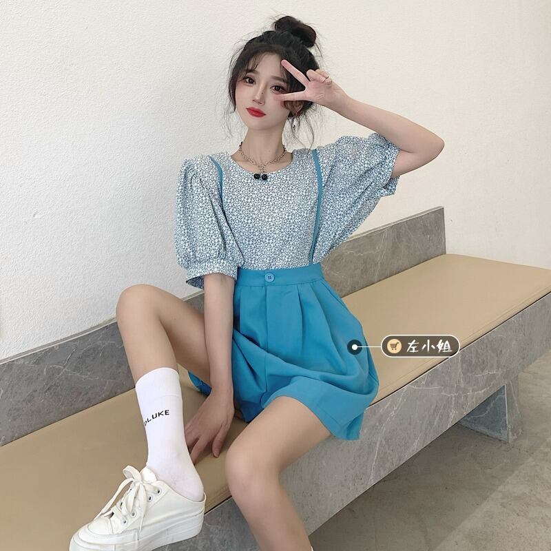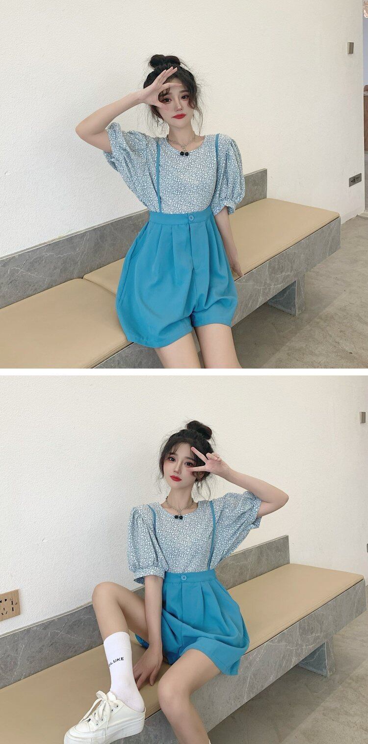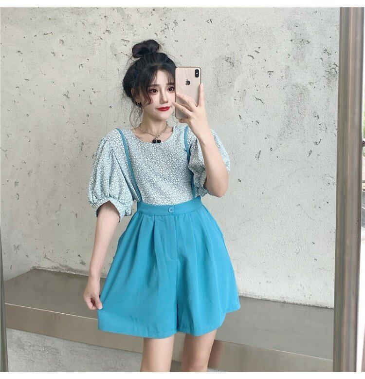 夏服レディースフローラルスリーブトップス ショーツ ブルー ストリート 大人ガーリー スウィート キュート カジュアル 夏物 花柄 コーデ marchs671195445773