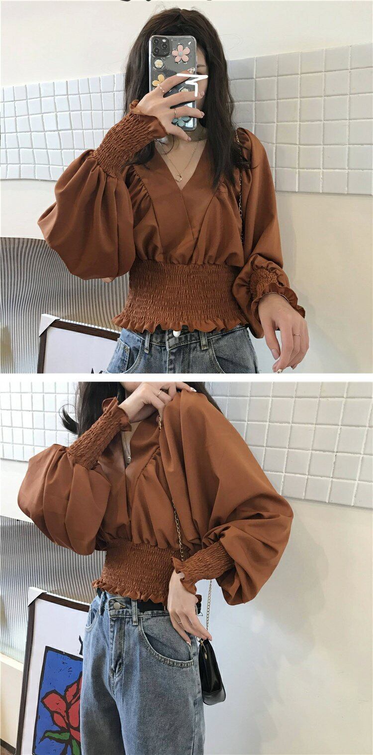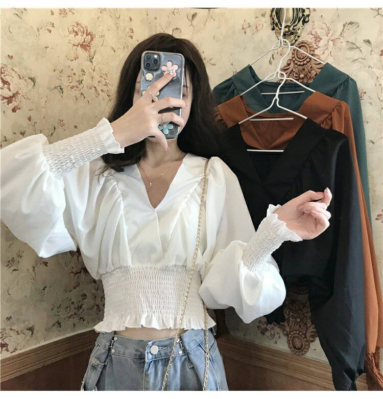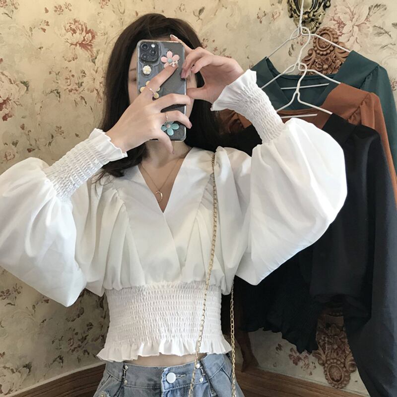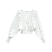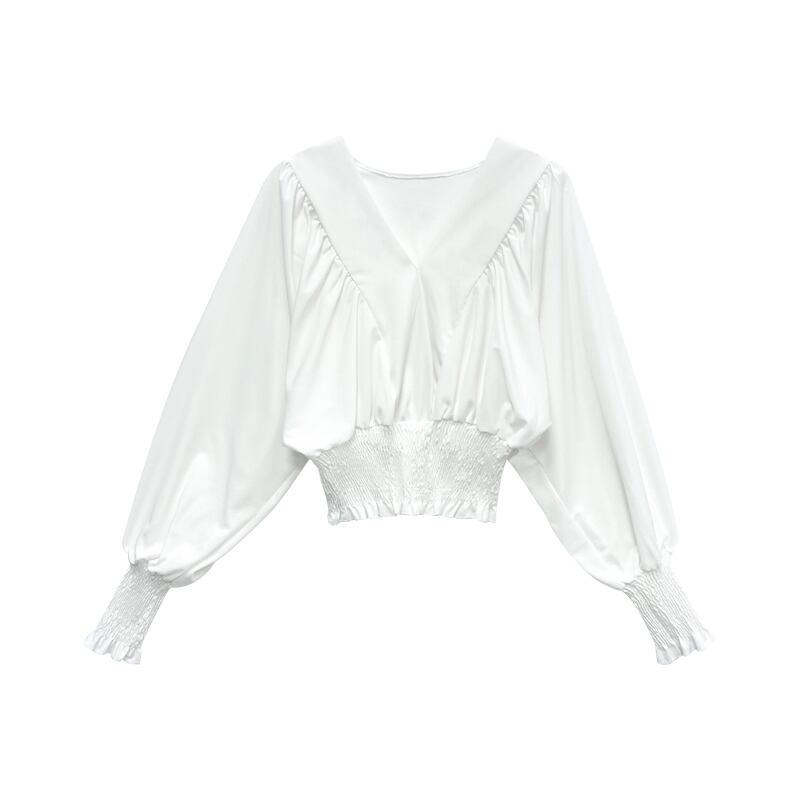ウェストブラウス スプリング秋物ホワイトシャツ パフスリーブスリーブショートVネック 春物 オータム ウエスト コーデ marchs6777820820522