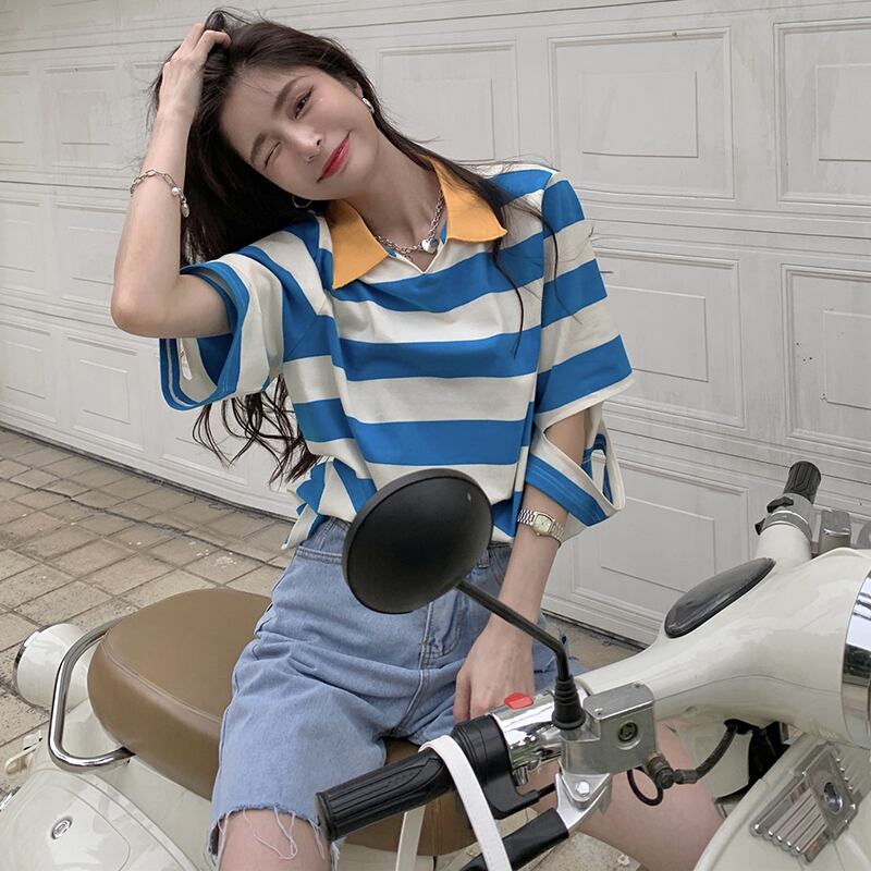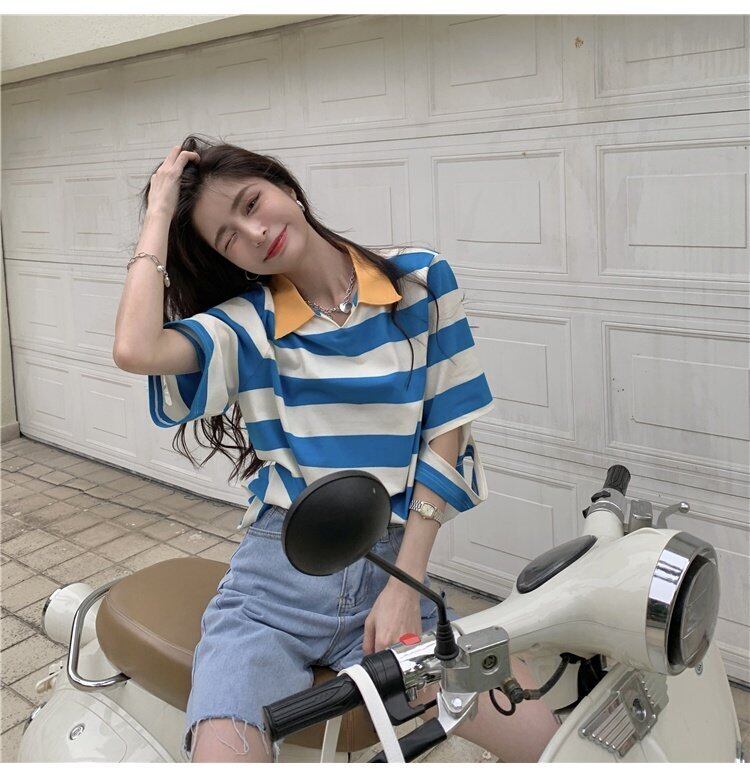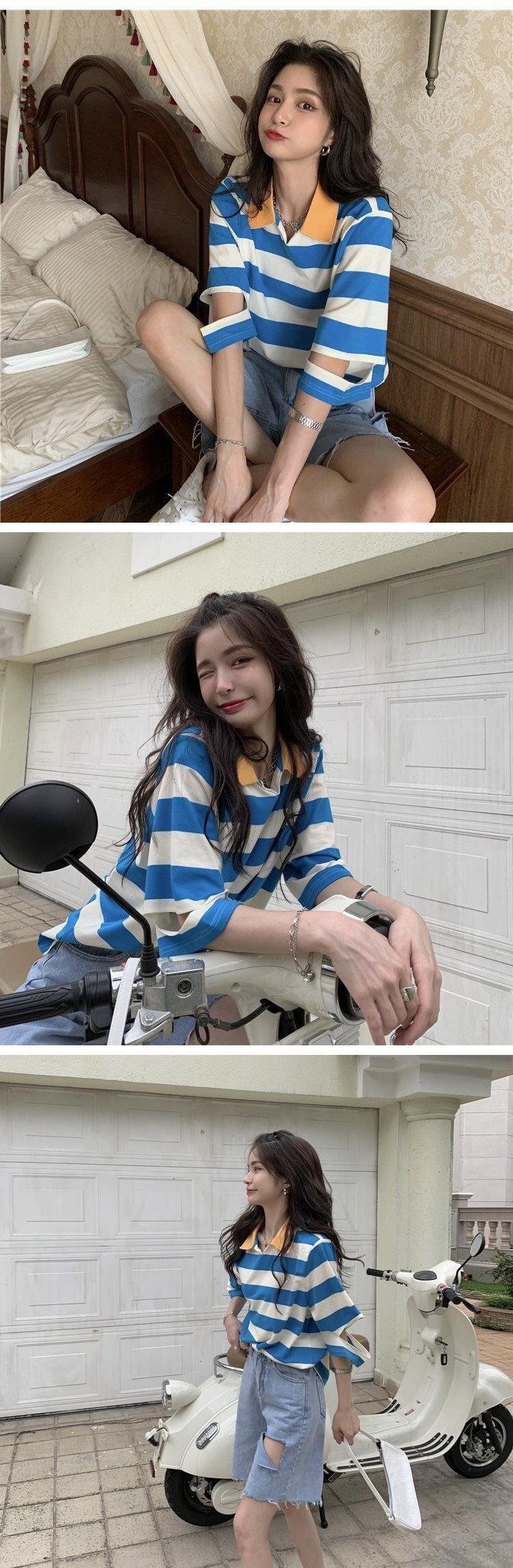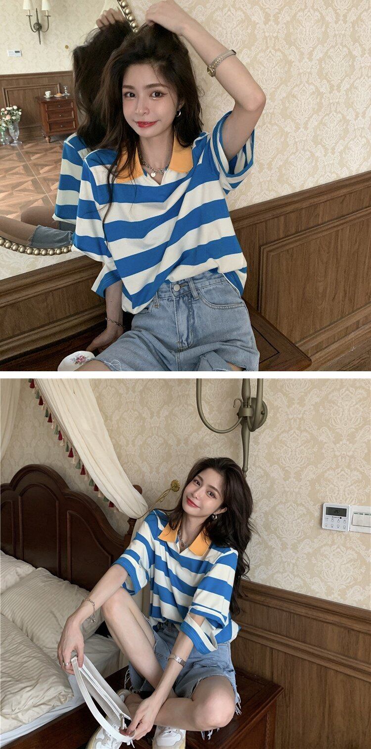 夏服韓国ファッションカラーストライプ半袖スリーブTシャツレディース ショート ハーフスリーブ 夏物 スタイル コーデ marchs6739883349020