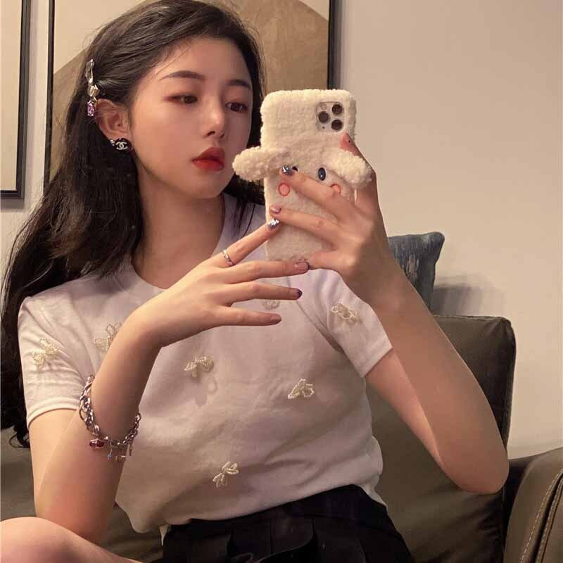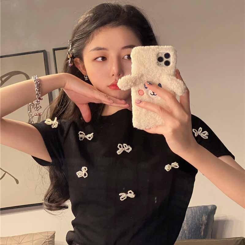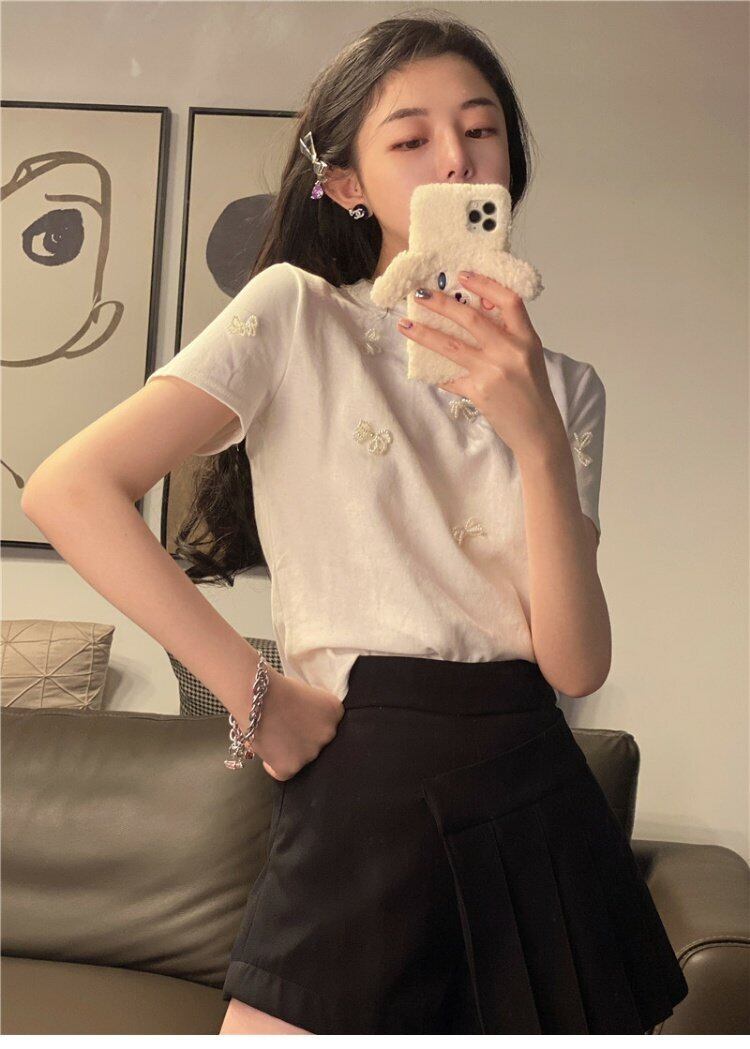 トップス 夏服ワンピース韓国ファッションスタイルルーズラウンドネック半袖スリーブTシャツレディース ショート リボン ハーフスリーブ 大人ガーリー スウィート キュート カジュアル 夏物 Oネック コーデ marchs6734772315414