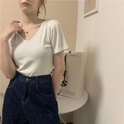 カラーVネックゆったりシャツ トップス 夏服スタイル韓国ファッションルーズストレッチブラックTシャツレディース エラスティック 伸縮 夏物 コーデ marchs6768740708387