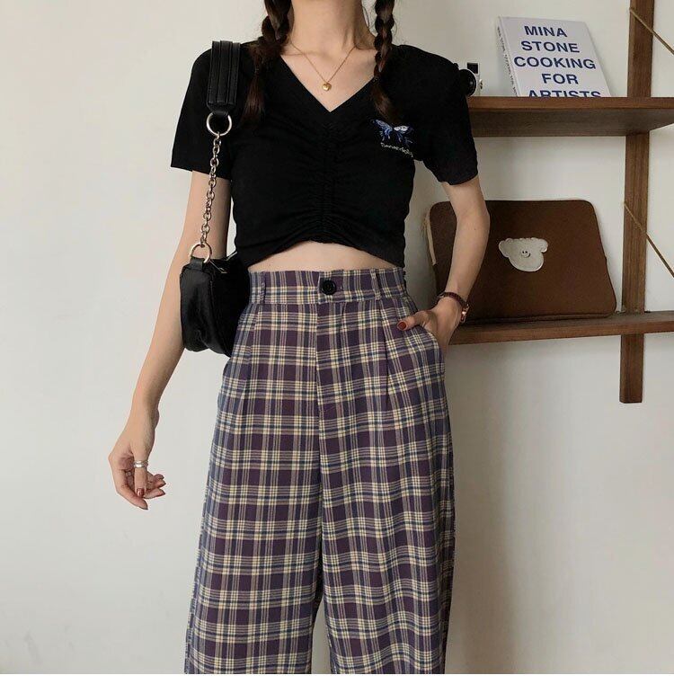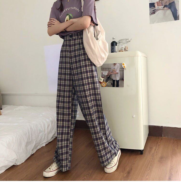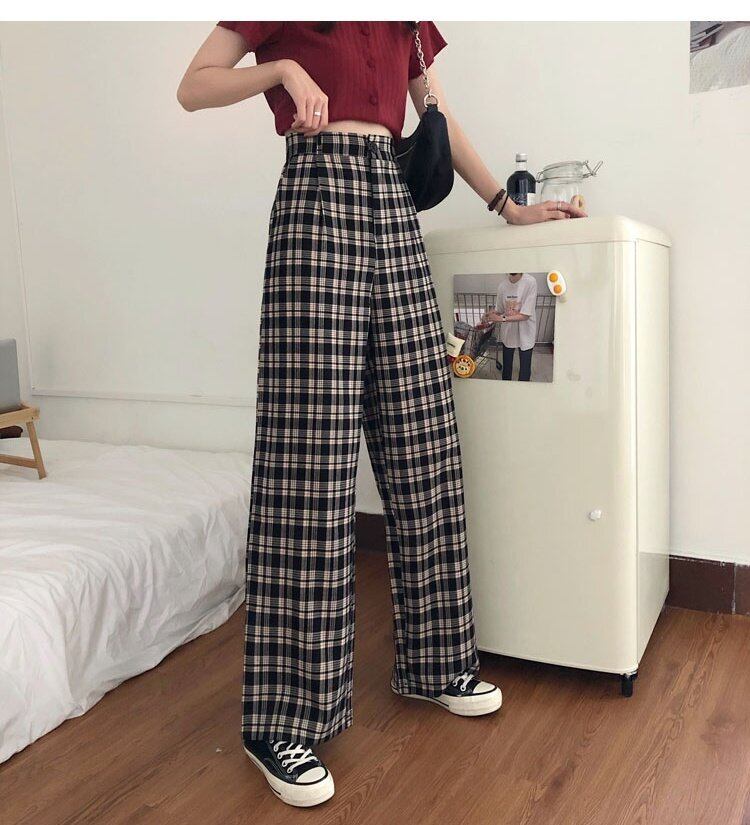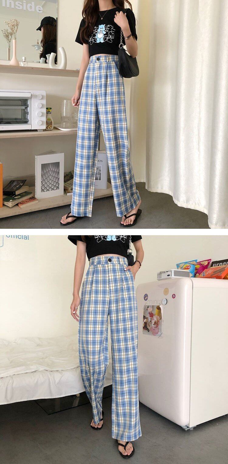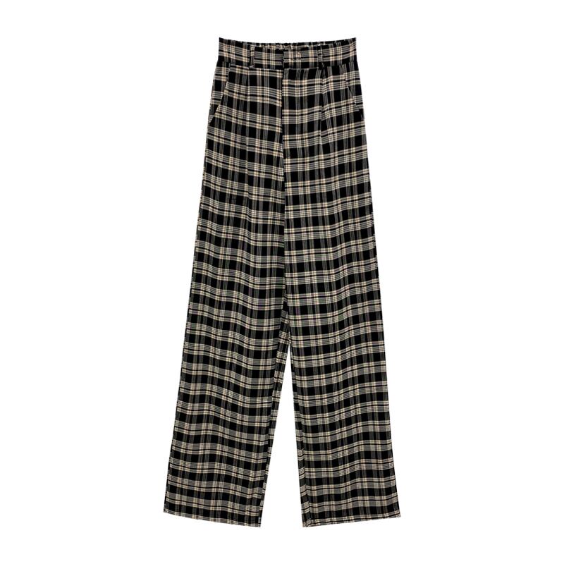 格子柄夏服薄手ルーズパンツ カジュアルハイウェスト 夏物 ウエスト コーデ marchs6719450403281
