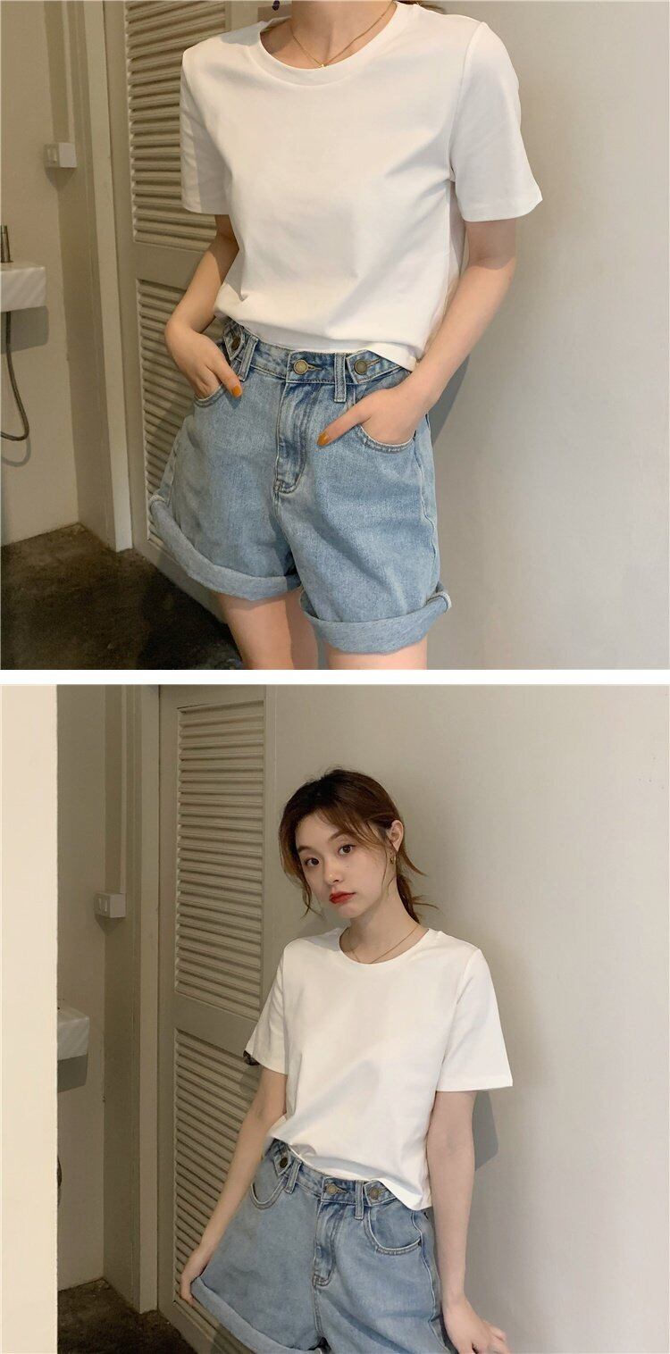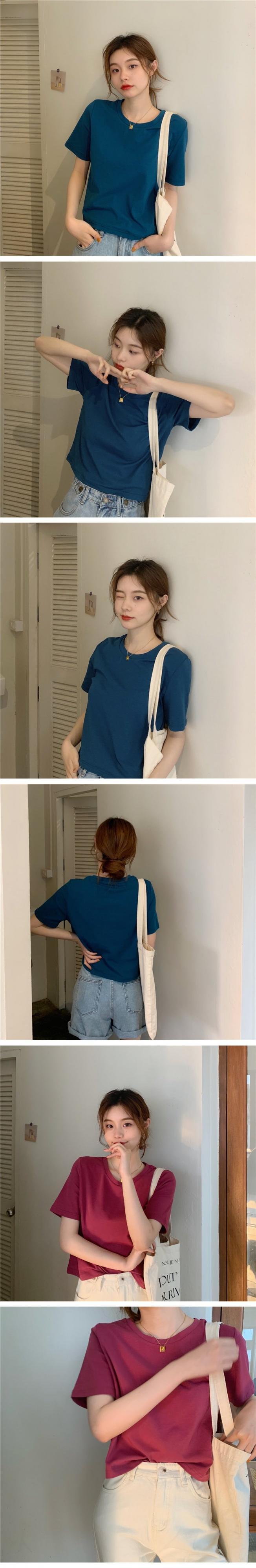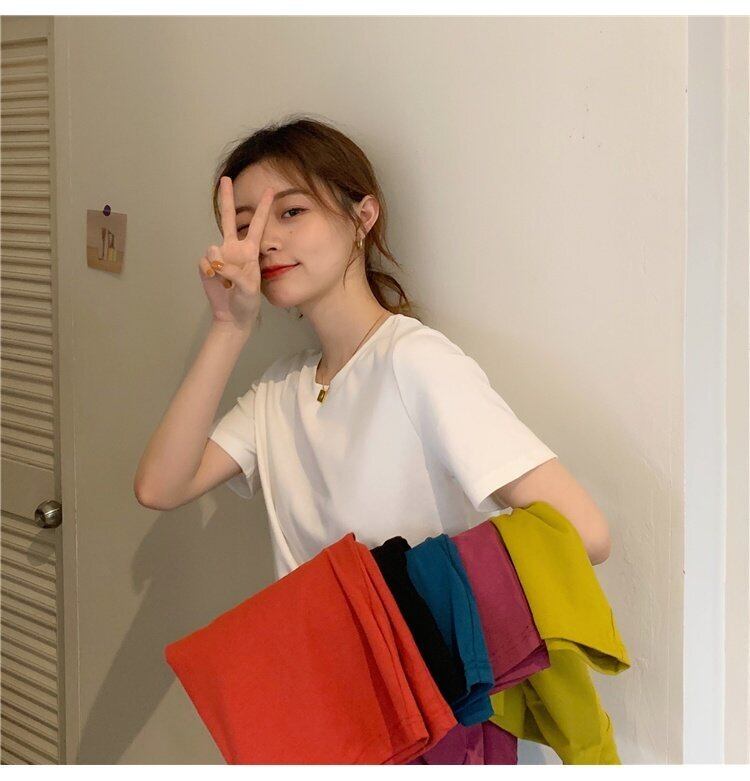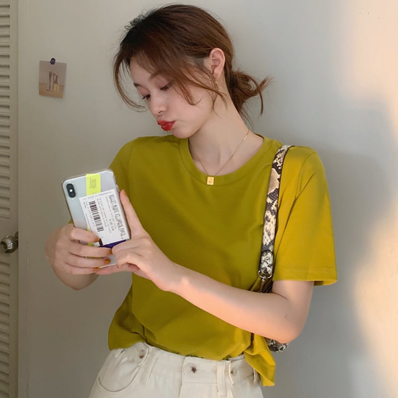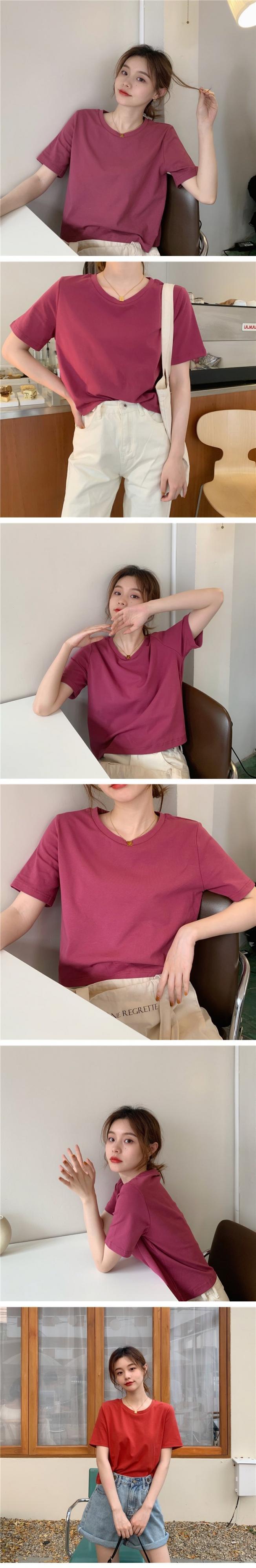 夏服韓国ファッションソリッド カラーラウンドネックショートスリムトップス ゆったりシャツ 半袖スリーブTシャツレディース ハーフスリーブ 夏物 Oネック ソリッドカラー コーデ marchs6784331001638