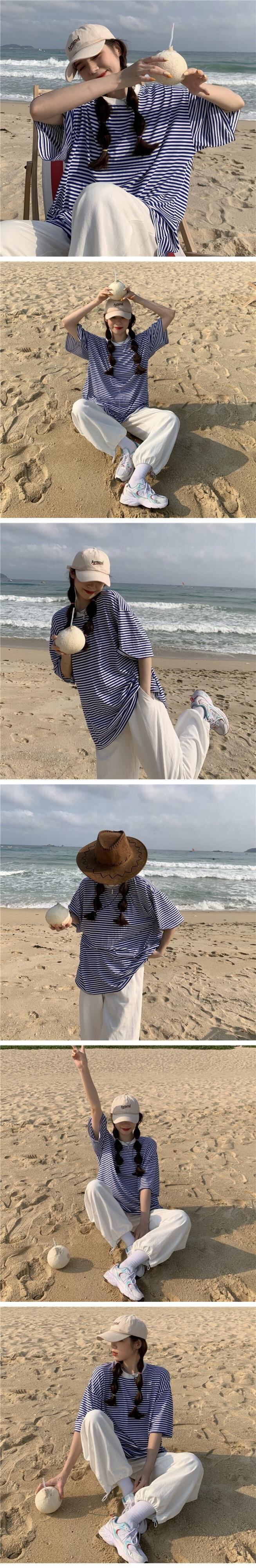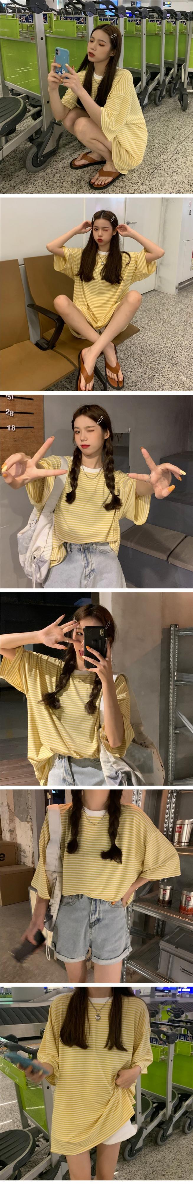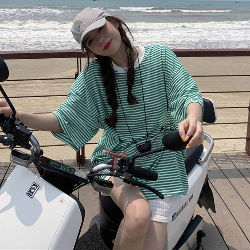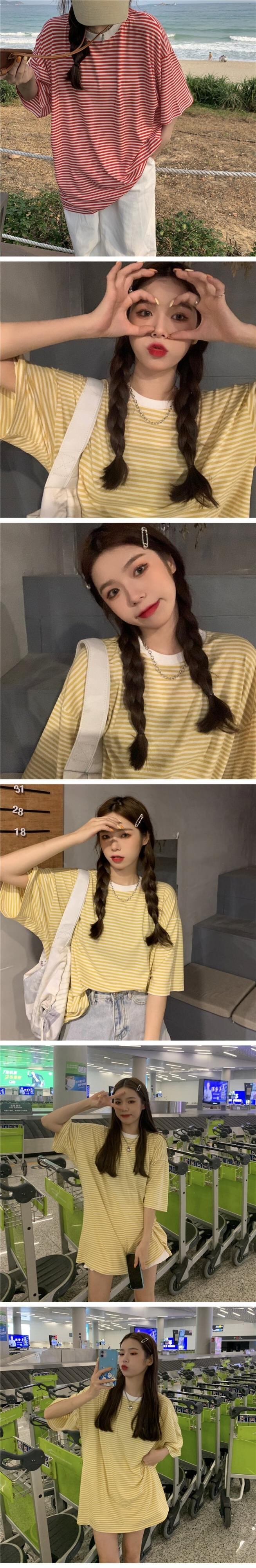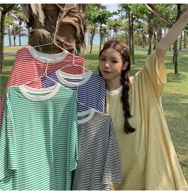 韓国ファッションストライプTシャツレディース夏服ルーズスタイルカラートップス 夏物 ボーイズ コーデ marchs6773305671267