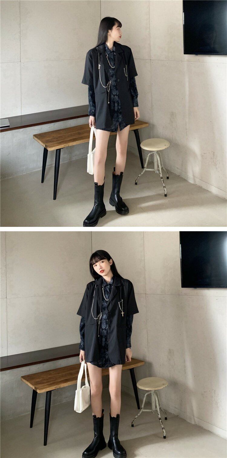 ダークレディーススタンダードブラックジャケット プリントシャツ トレンド レトロ コーデ marchs6748805661558