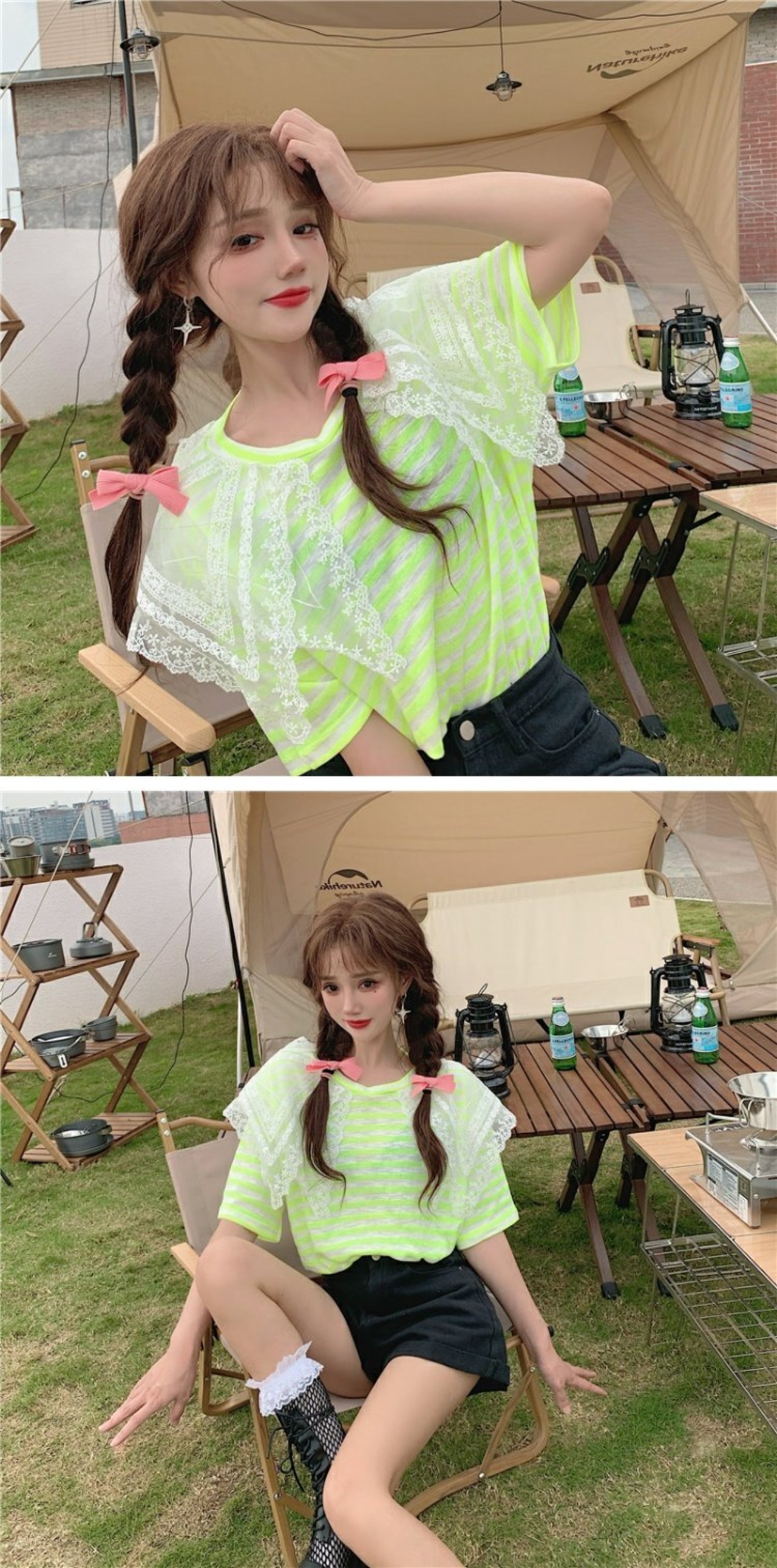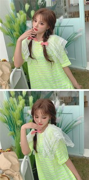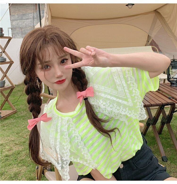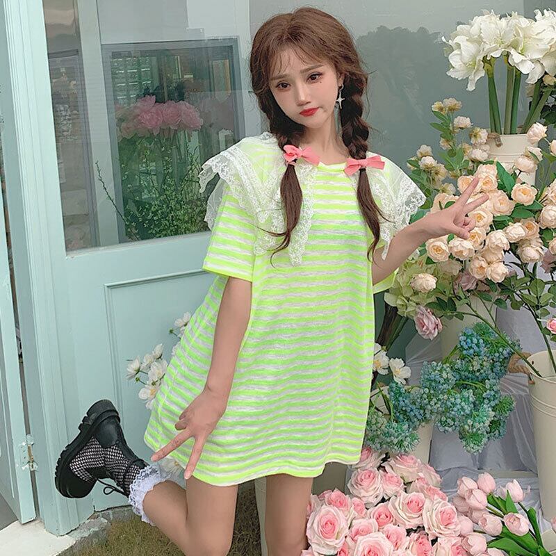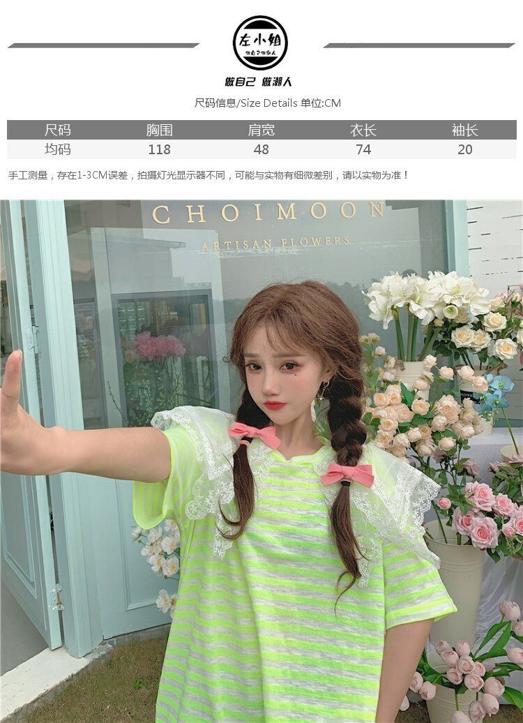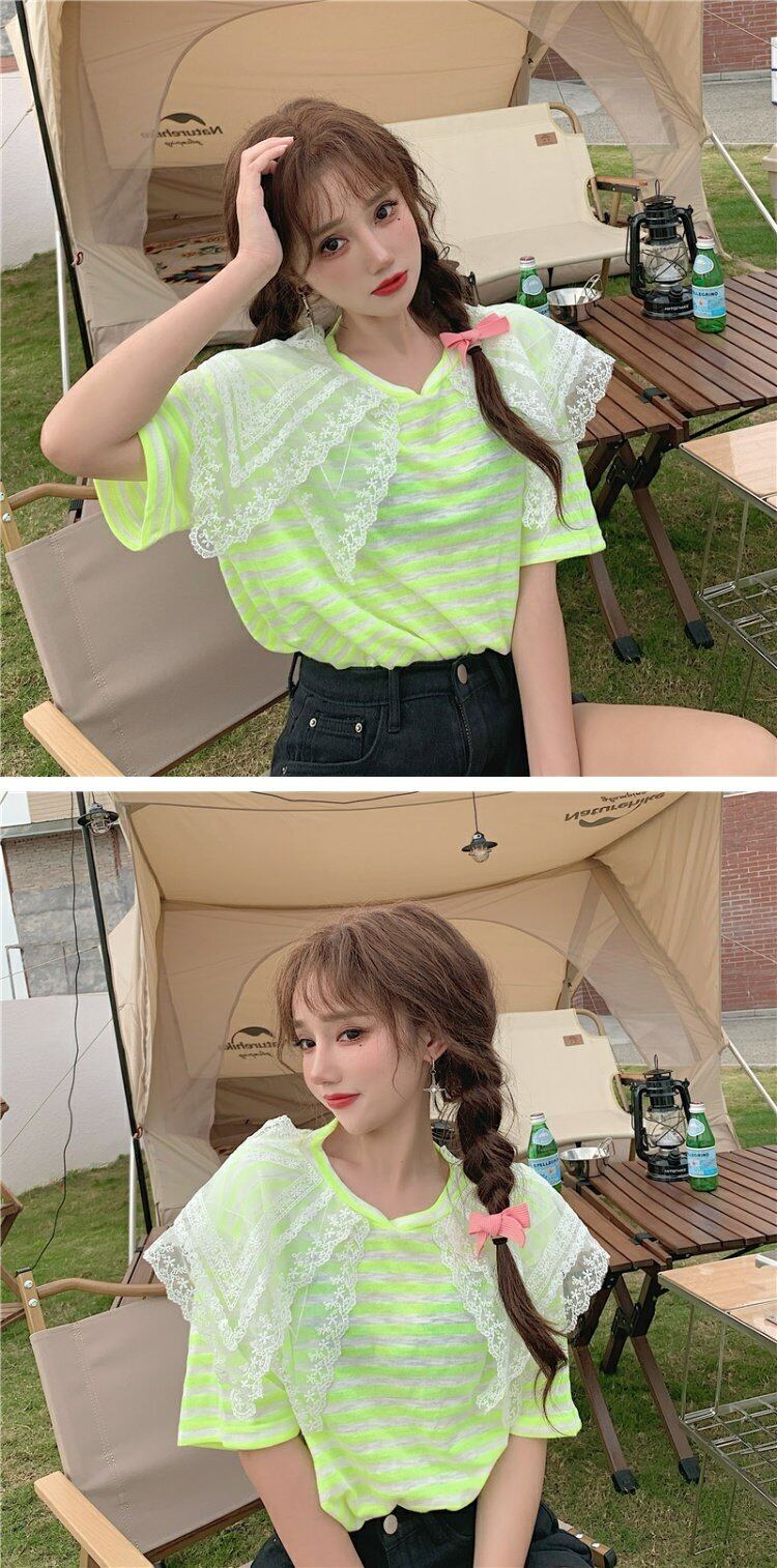 夏服ストライプレースカラーグリーンTシャツレディース 大人ガーリー スウィート キュート カジュアル 夏物 ステッチ コーデ marchs671756948199