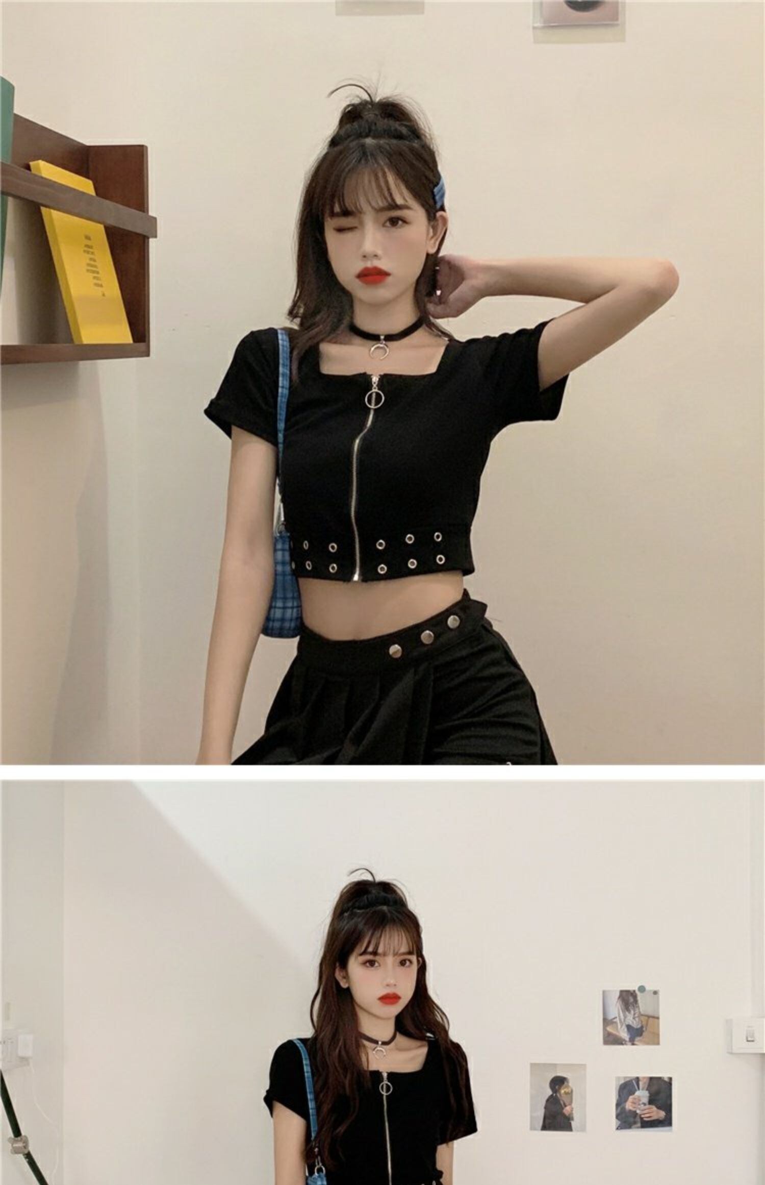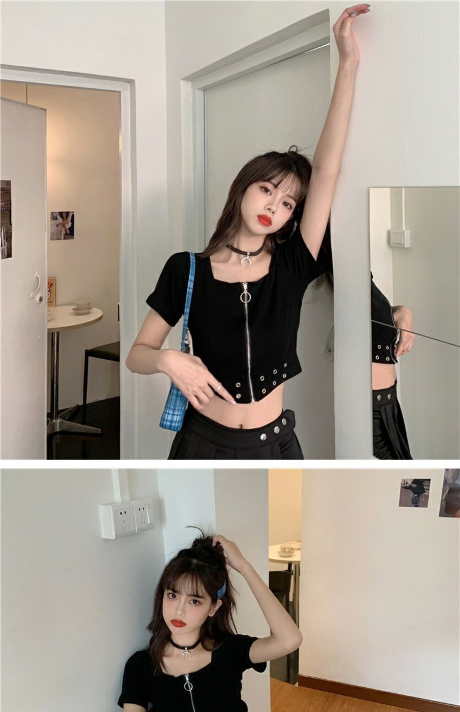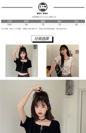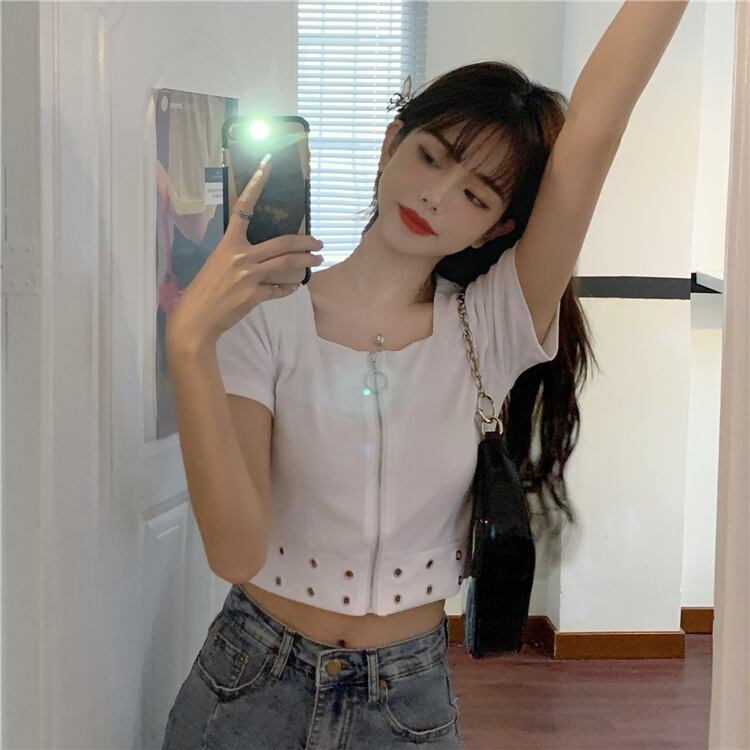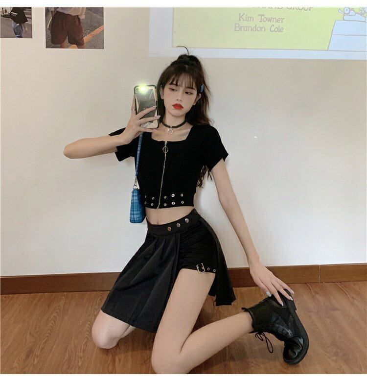 ブラックTシャツレディース夏服ダークハイウェストウェストショートトレンド半袖スリーブジッパーカラートップス ハーフスリーブ 夏物 スクウェア ウエスト コーデ marchs6716234837720