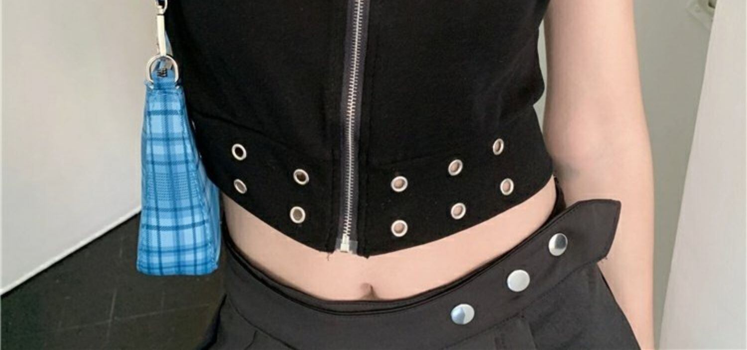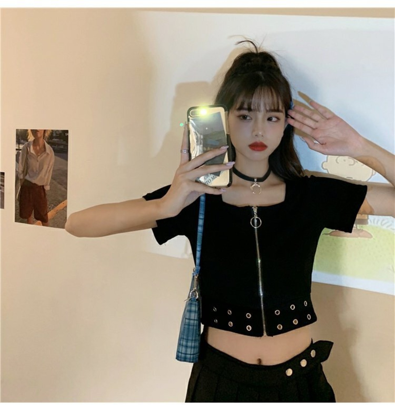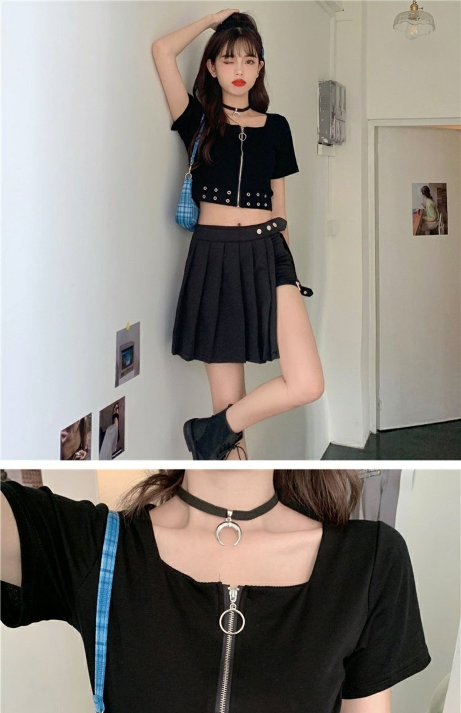 ブラックTシャツレディース夏服ダークハイウェストウェストショートトレンド半袖スリーブジッパーカラートップス ハーフスリーブ 夏物 スクウェア ウエスト コーデ marchs6716234837720