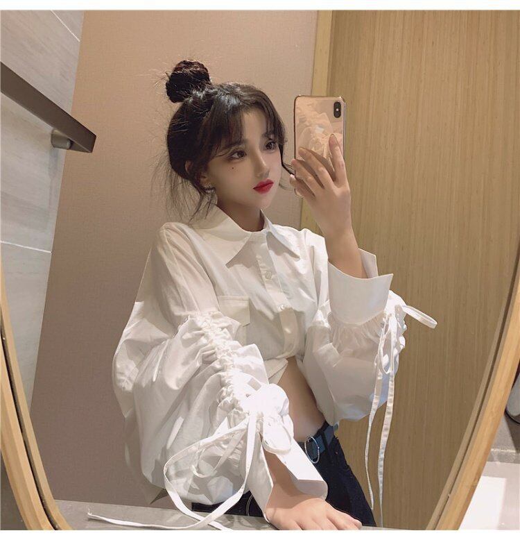 ホワイトシャツ レディーススプリングギャザースリーブルーズクロップトップ トップス ランタンスリーブ 春物 コーデ marchs6775321031096