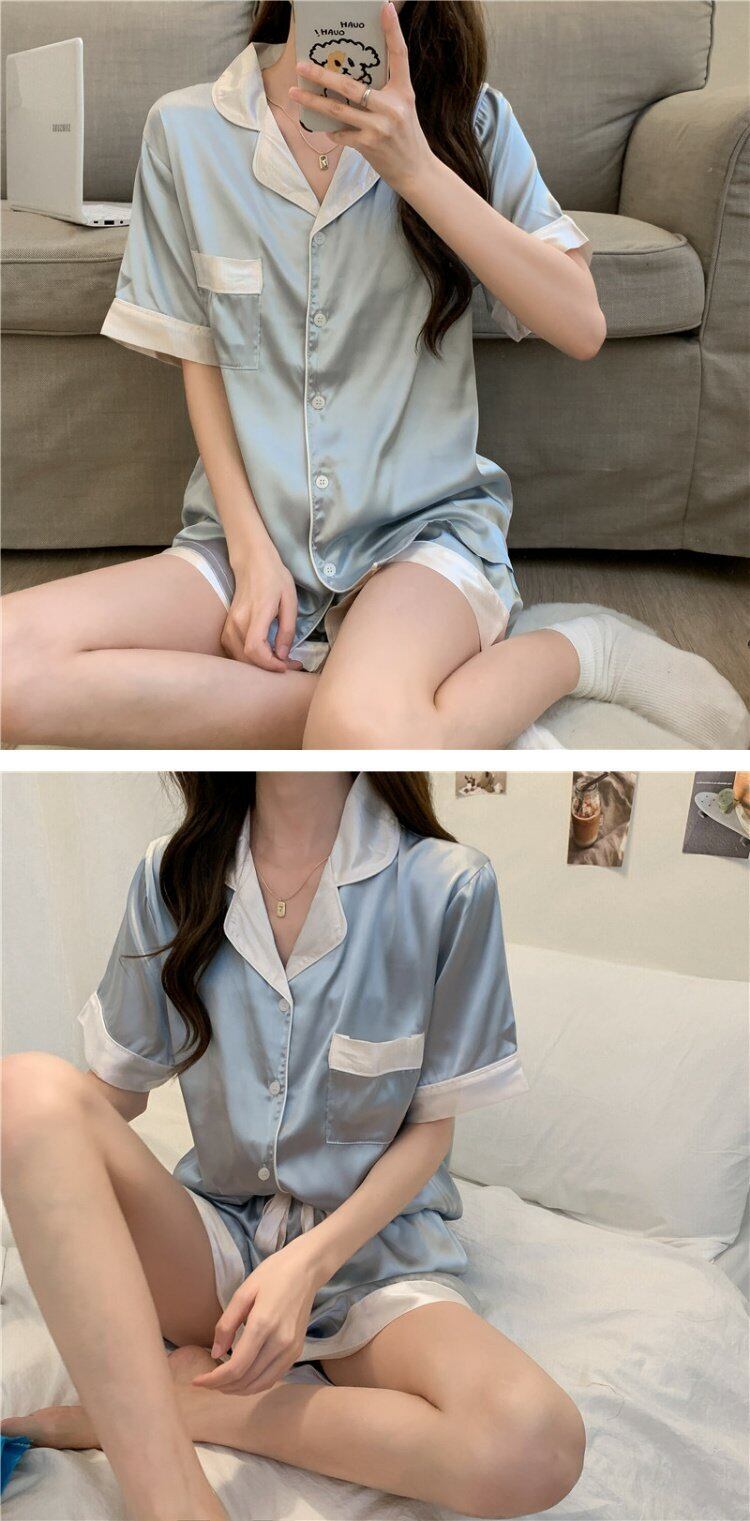 夏服サテントレンドショートブルーレディース 夏物 シルク コーデ marchs6795034394082
