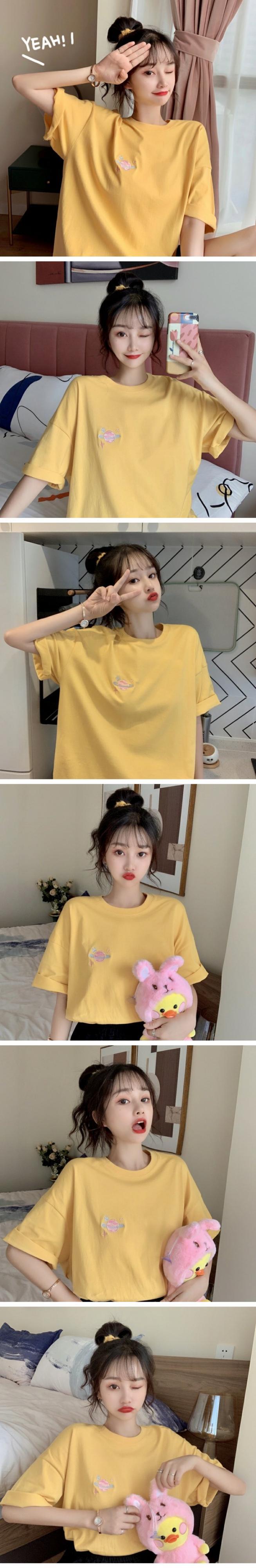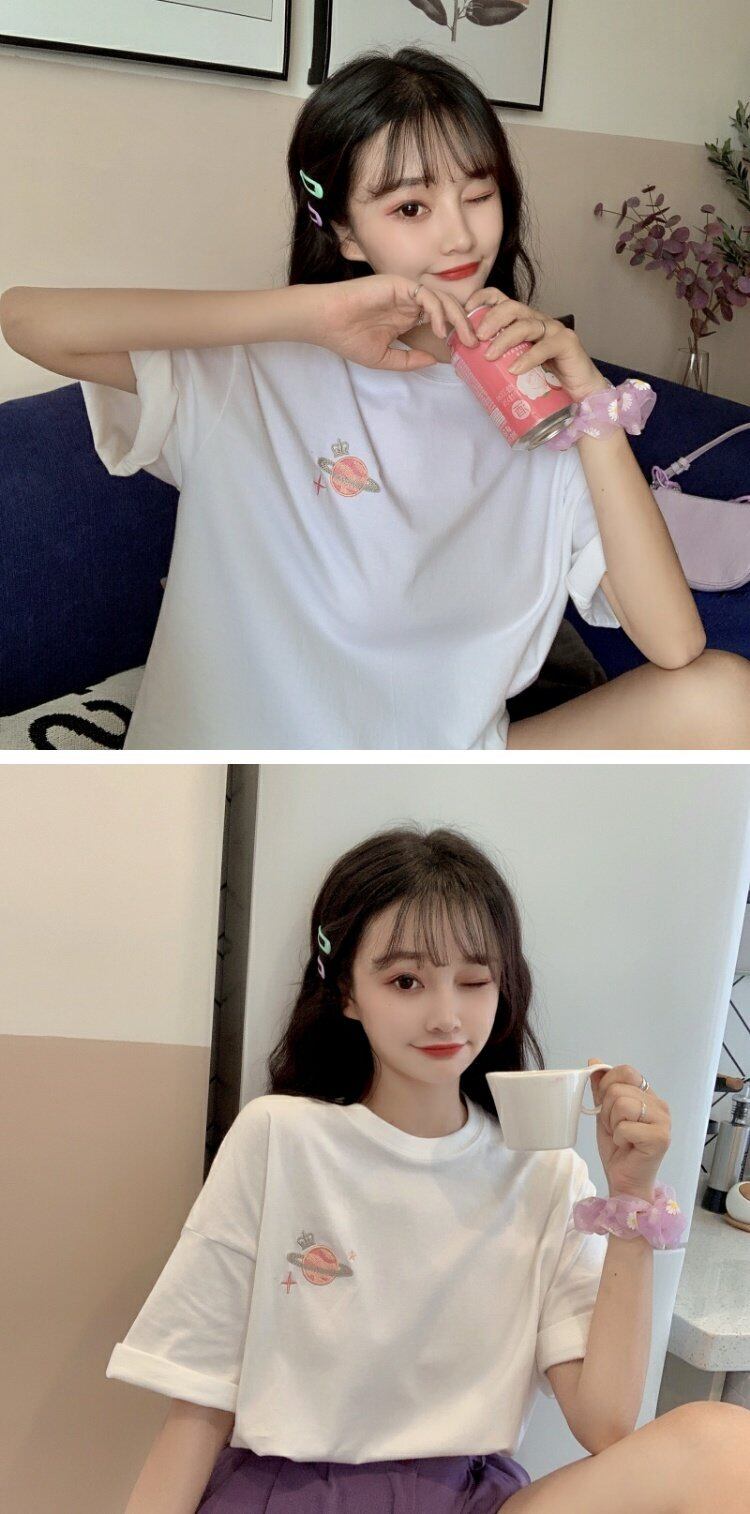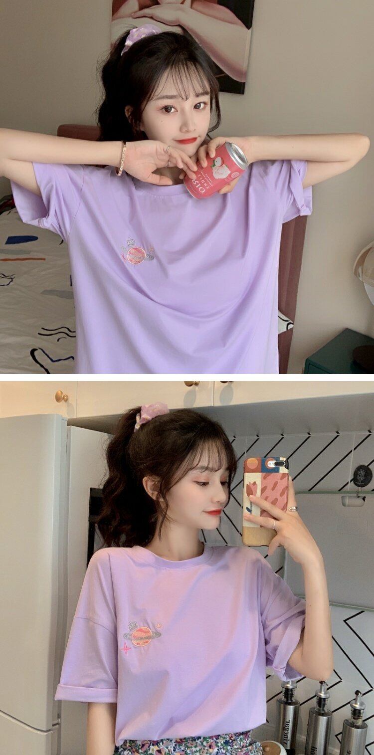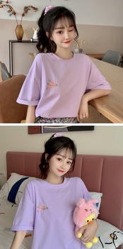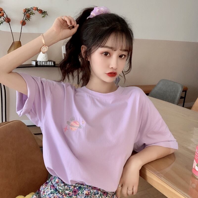 夏服韓国ファッションルーズトップス Tシャツレディース レッド 刺繍 大人ガーリー スウィート キュート カジュアル 夏物 パープル コーデ marchs6790221736303