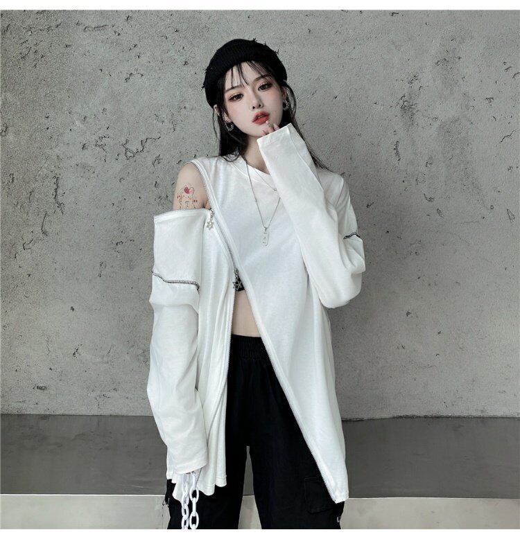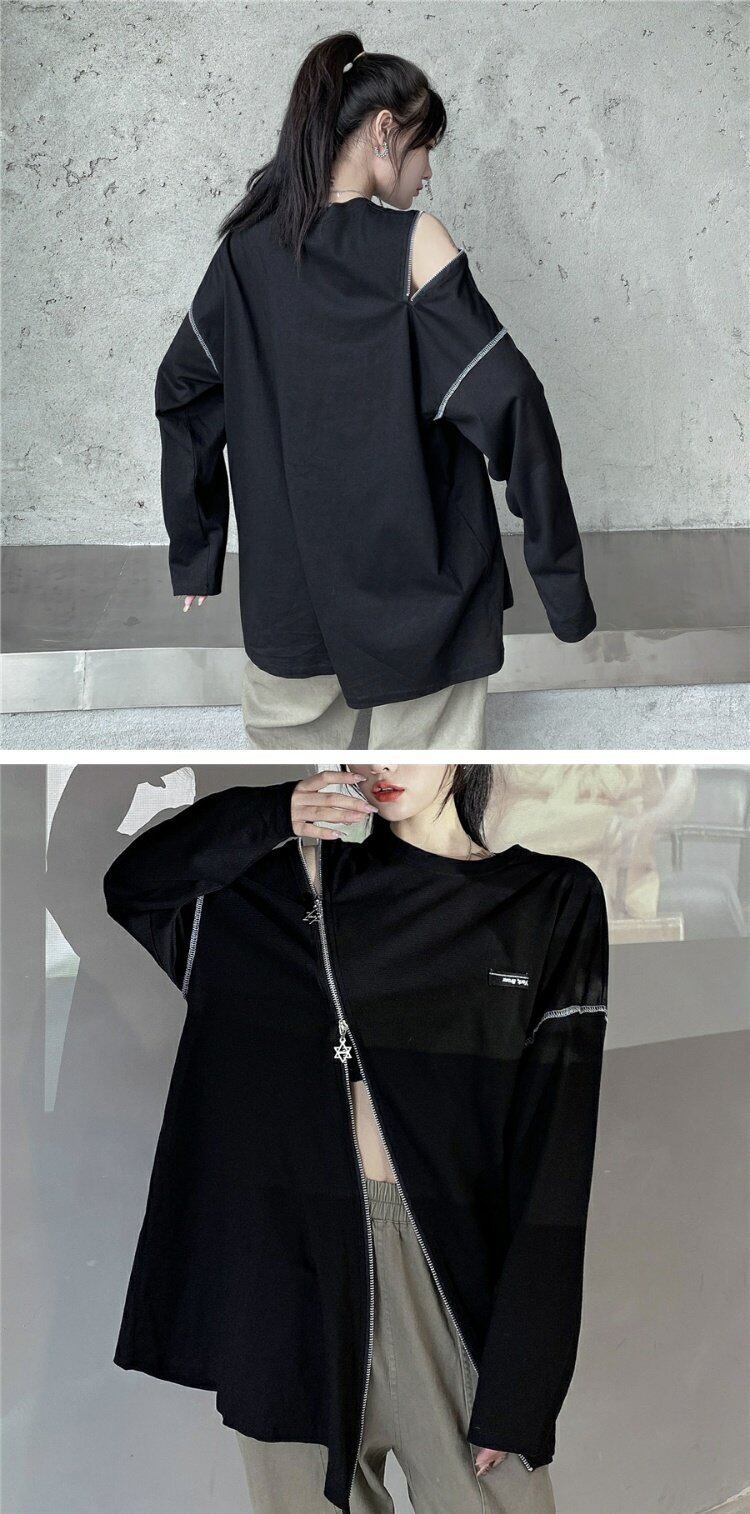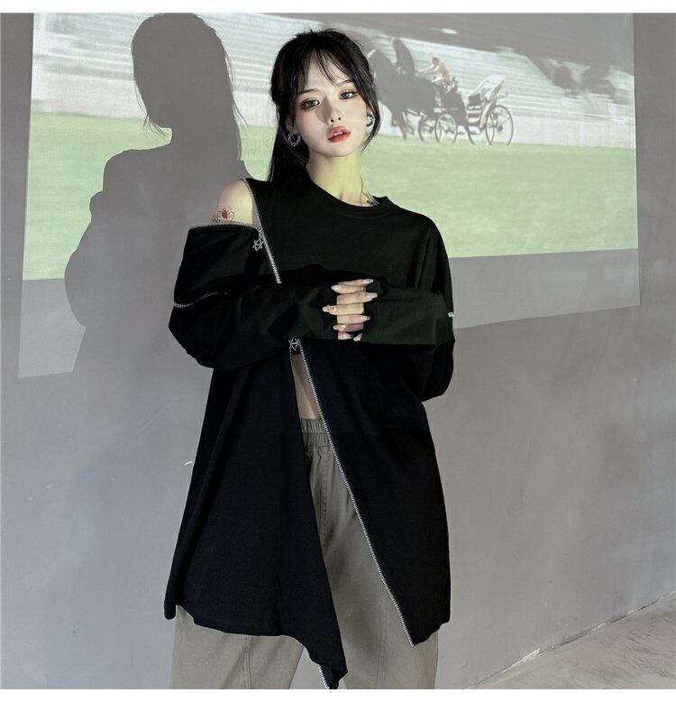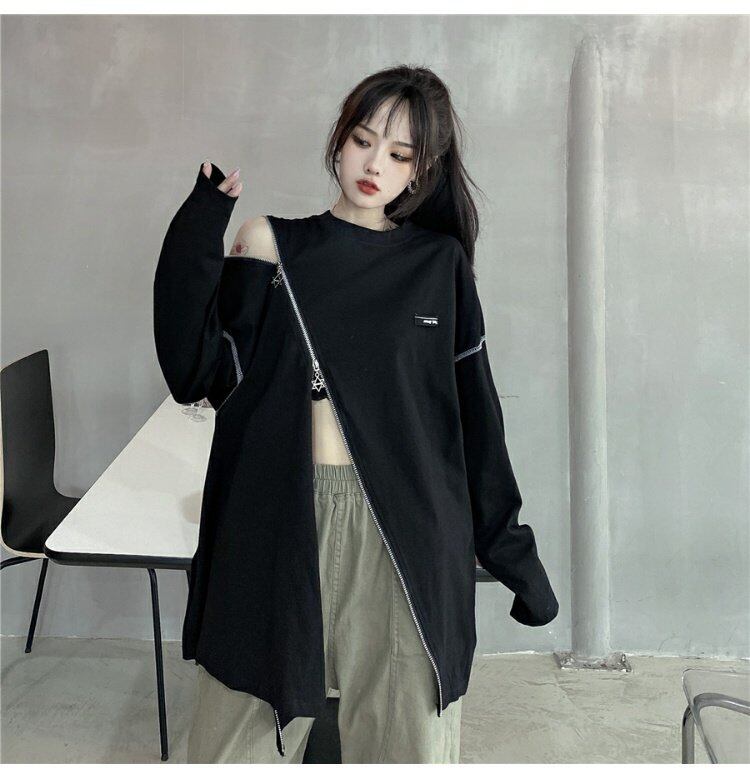 スプリングスタイルルーズストラップレスジッパートップス Tシャツレディース ロング 原宿 春物 長袖 ミドル丈 コーデ marchs6799689695910