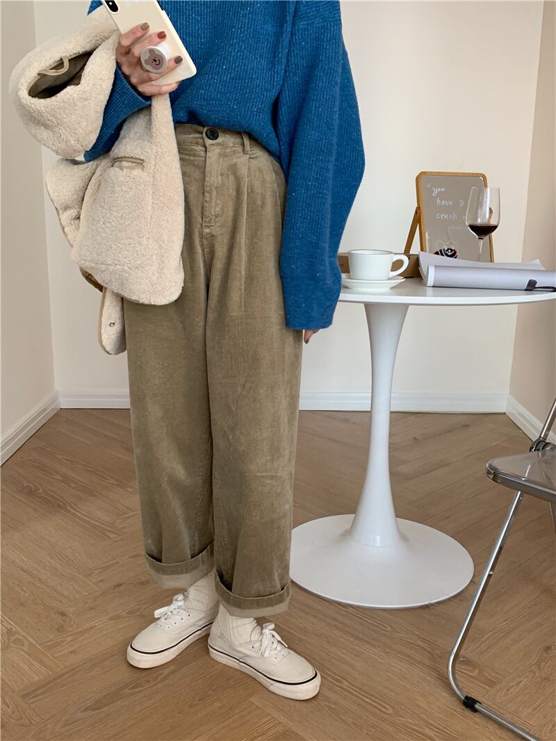 色:青いセーター,ラムベスト,カーキ色のズボン
