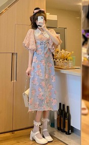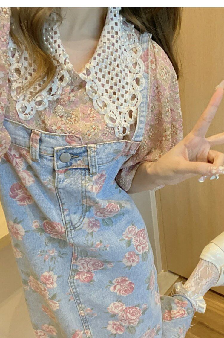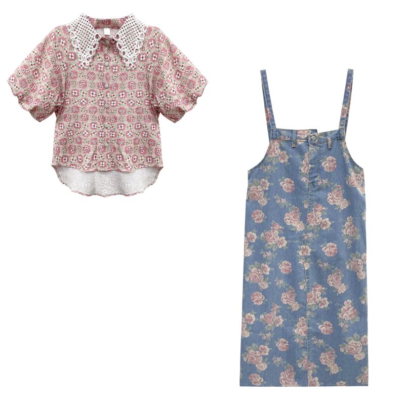 色:ピンクトップ,花柄ストラップ付きデニムスカート