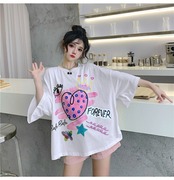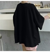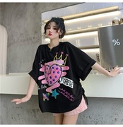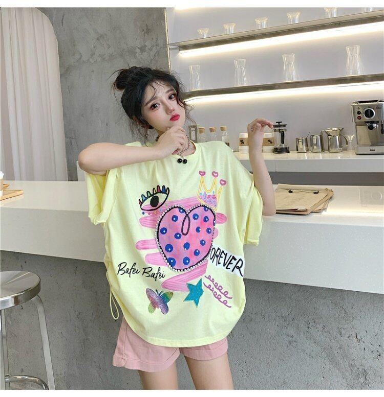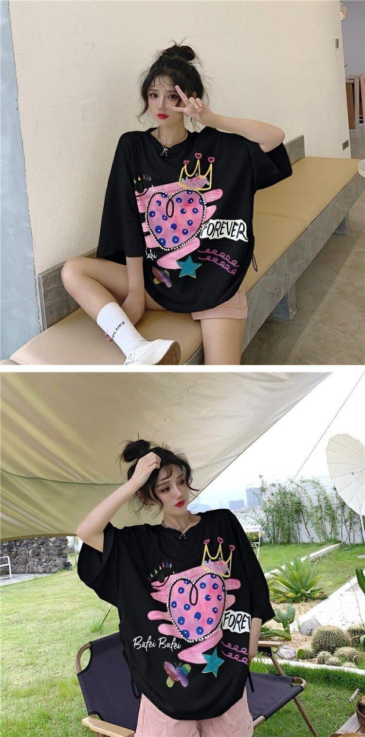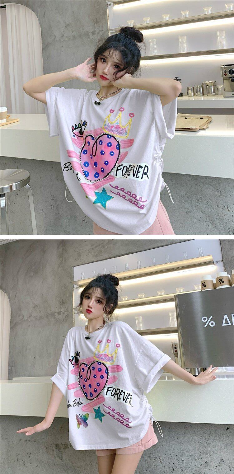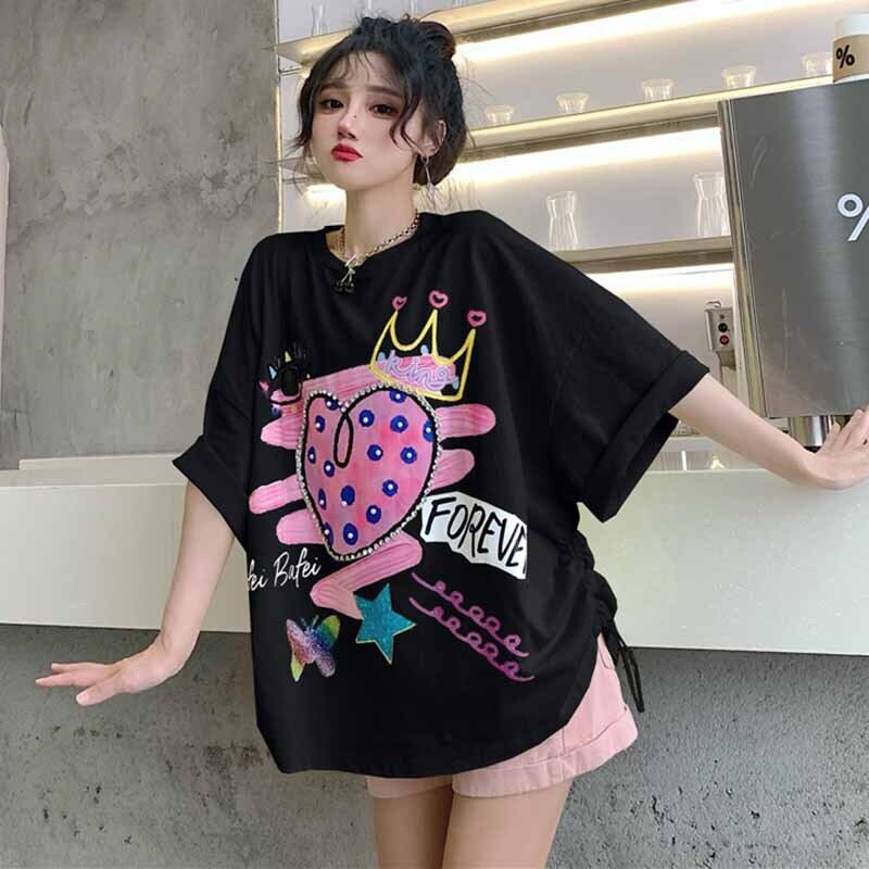 センスニッチドローストリンググラフィティプリントブラック半袖Tシャツ女性2021年夏新しいルーズハーフスリーブトップ 夏物 コーデ marchs6772824189603