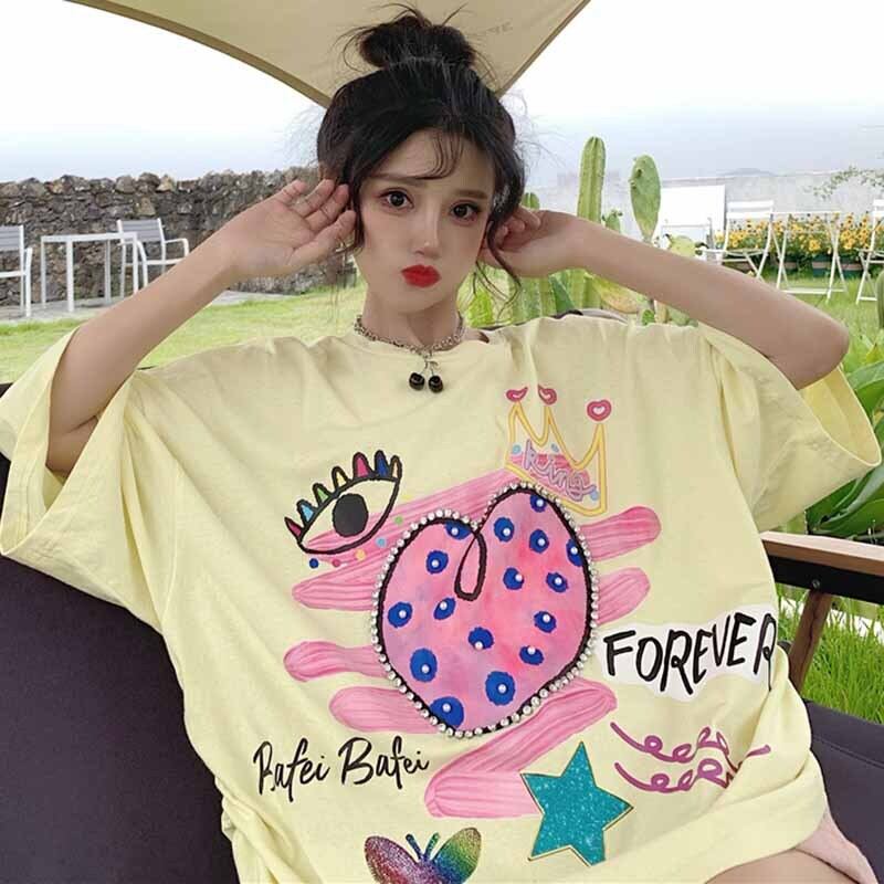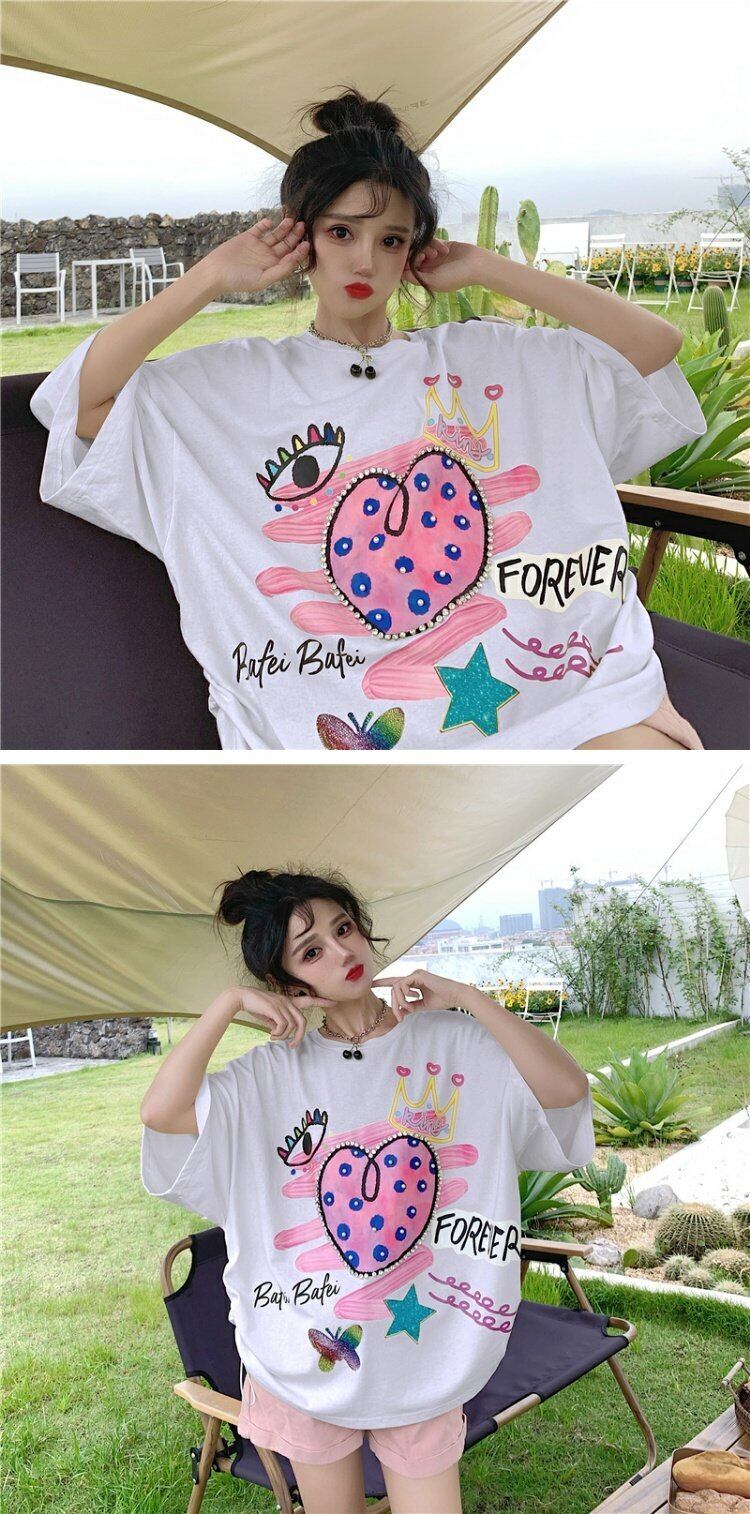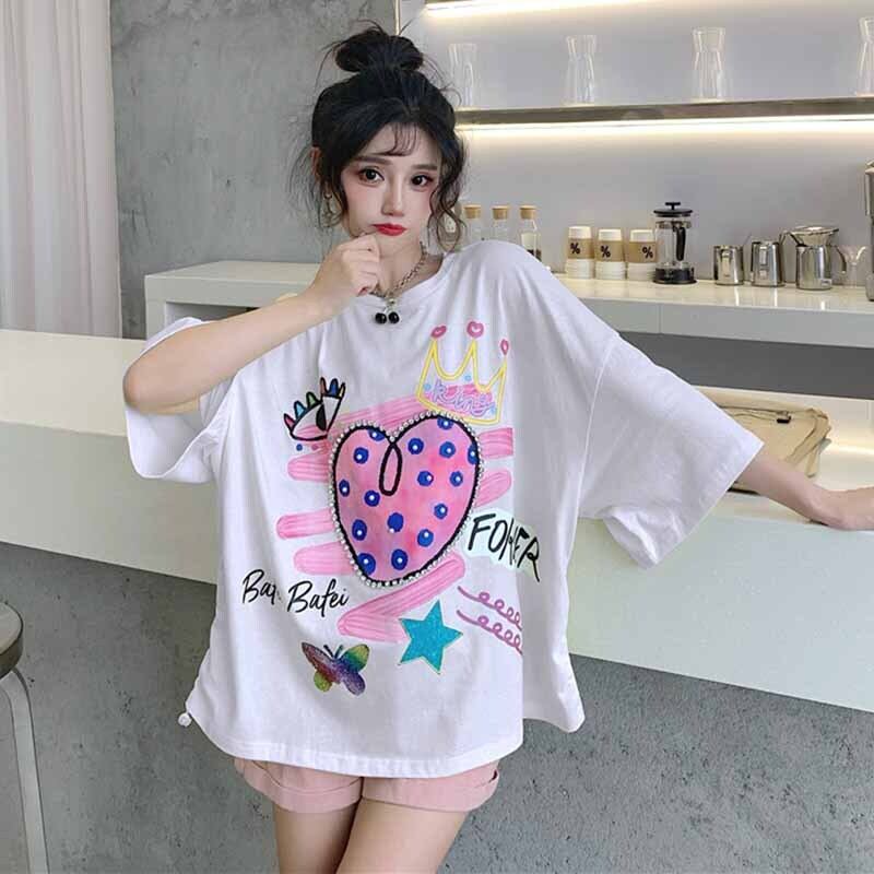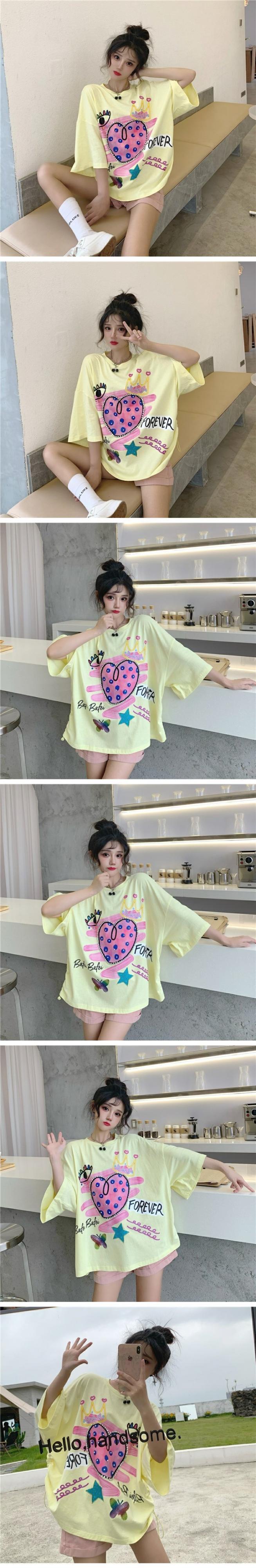 センスニッチドローストリンググラフィティプリントブラック半袖Tシャツ女性2021年夏新しいルーズハーフスリーブトップ 夏物 コーデ marchs6772824189603