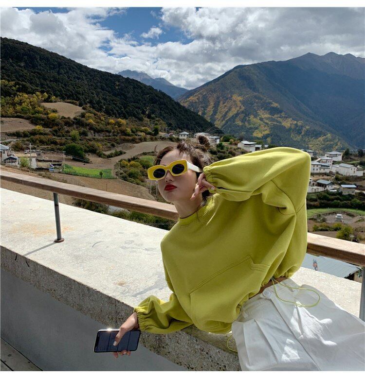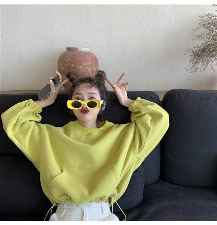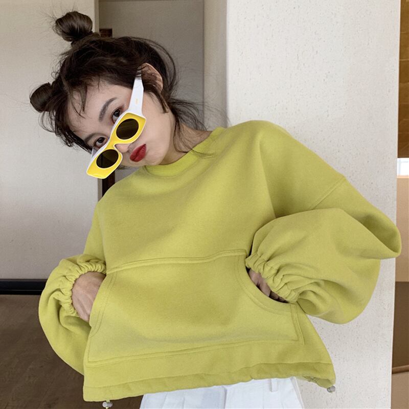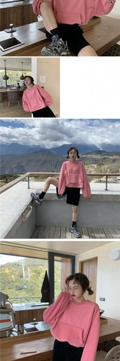 スプリング韓国ファッションルーズスタイルギャザーショートトップス 薄手厚みプルオーバー ラウンドネックセーター 春物 Oネック コーデ marchs6723191649625