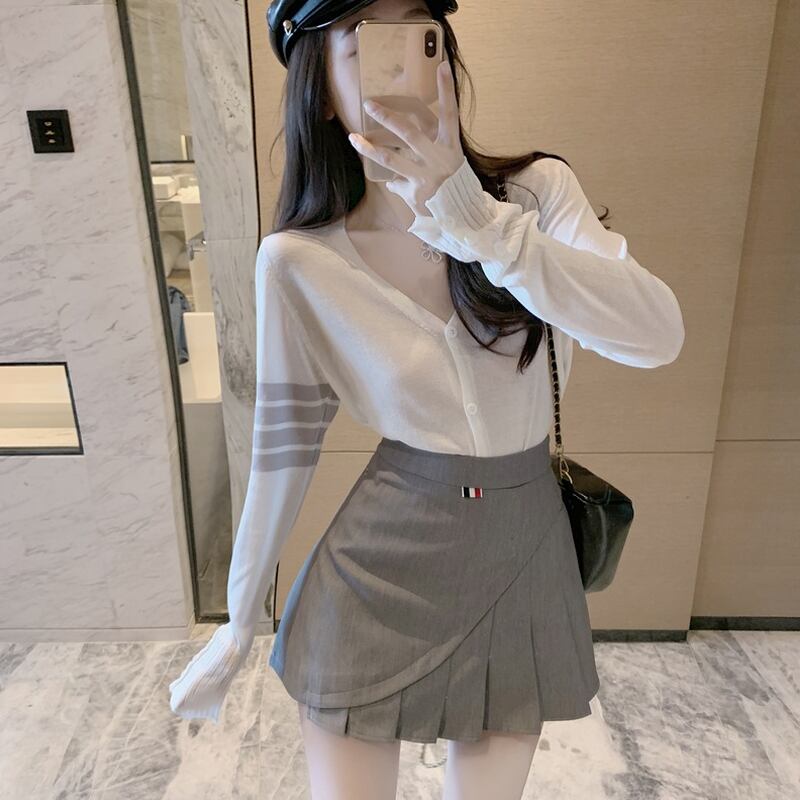 色:遊び心のあるピンクのカーディガン,オールマッチのホワイトカーディガン,気質グレーカーディガン,白いスカート,黒スカート,グレースカート