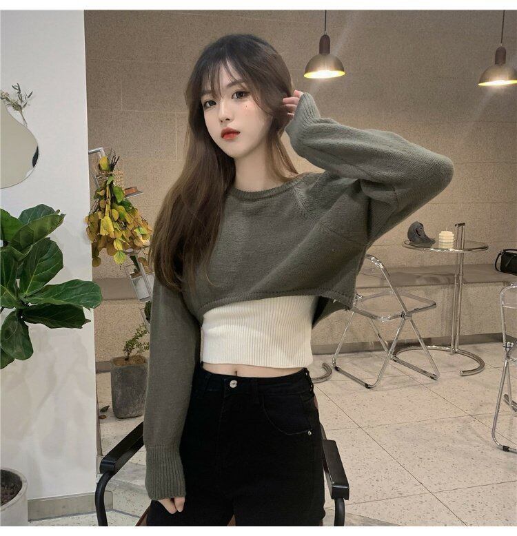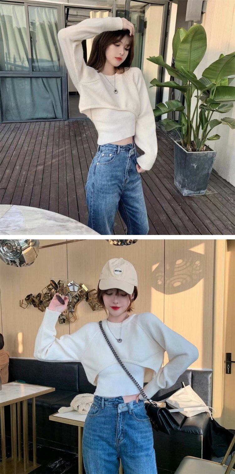 ショートクロップトップ トップス 長袖スリーブホワイトニットゆったりシャツ スタイルセーター ロング コーデ marchs6737761975446