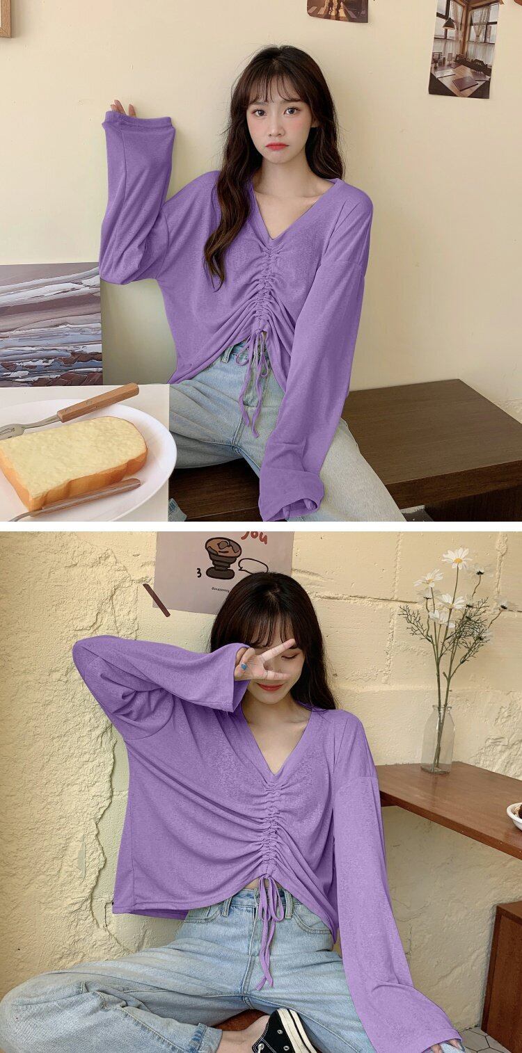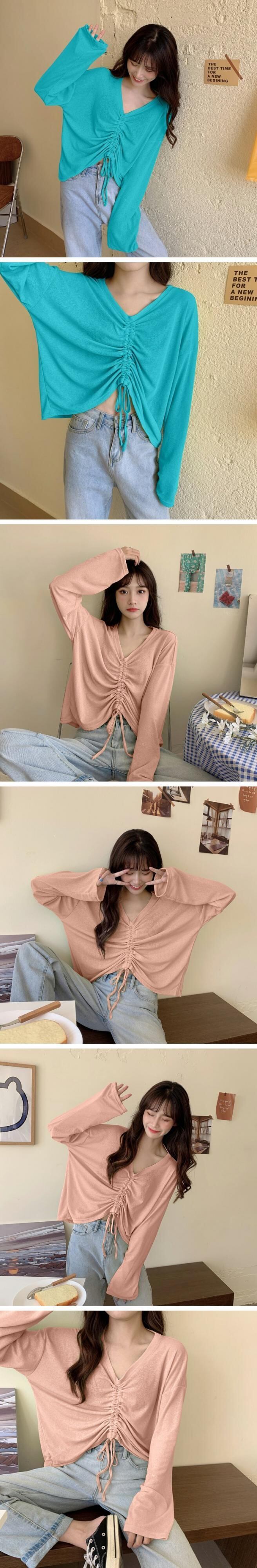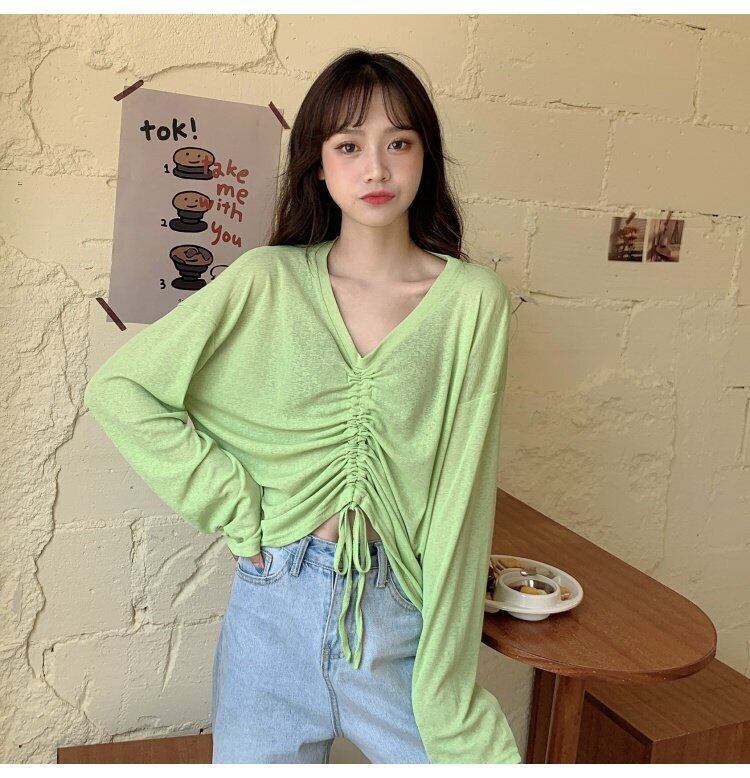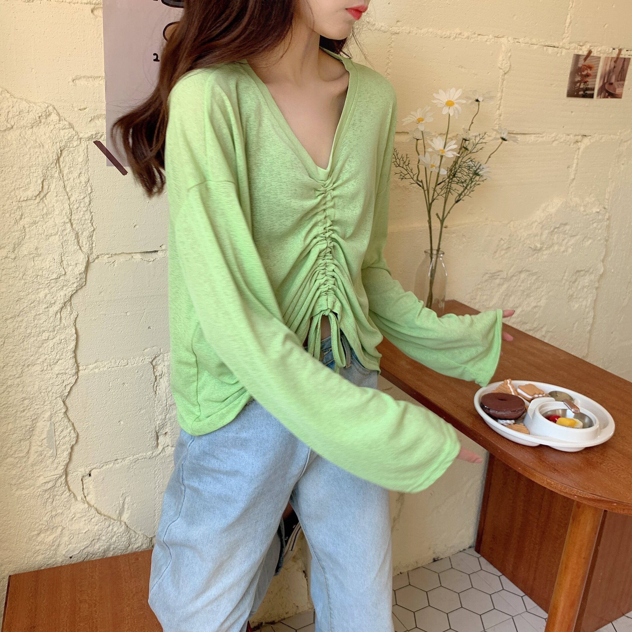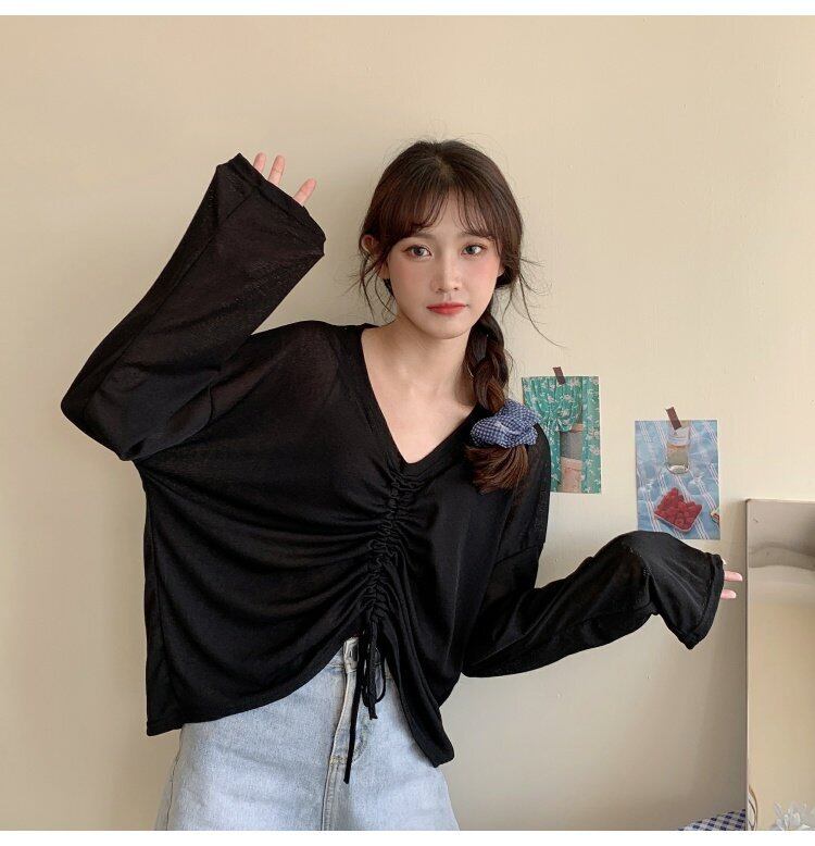 シャツ Tシャツ夏服Vネックギャザーニットトップス ロング 夏物 シルク 長袖 コーデ marchs6799091549841