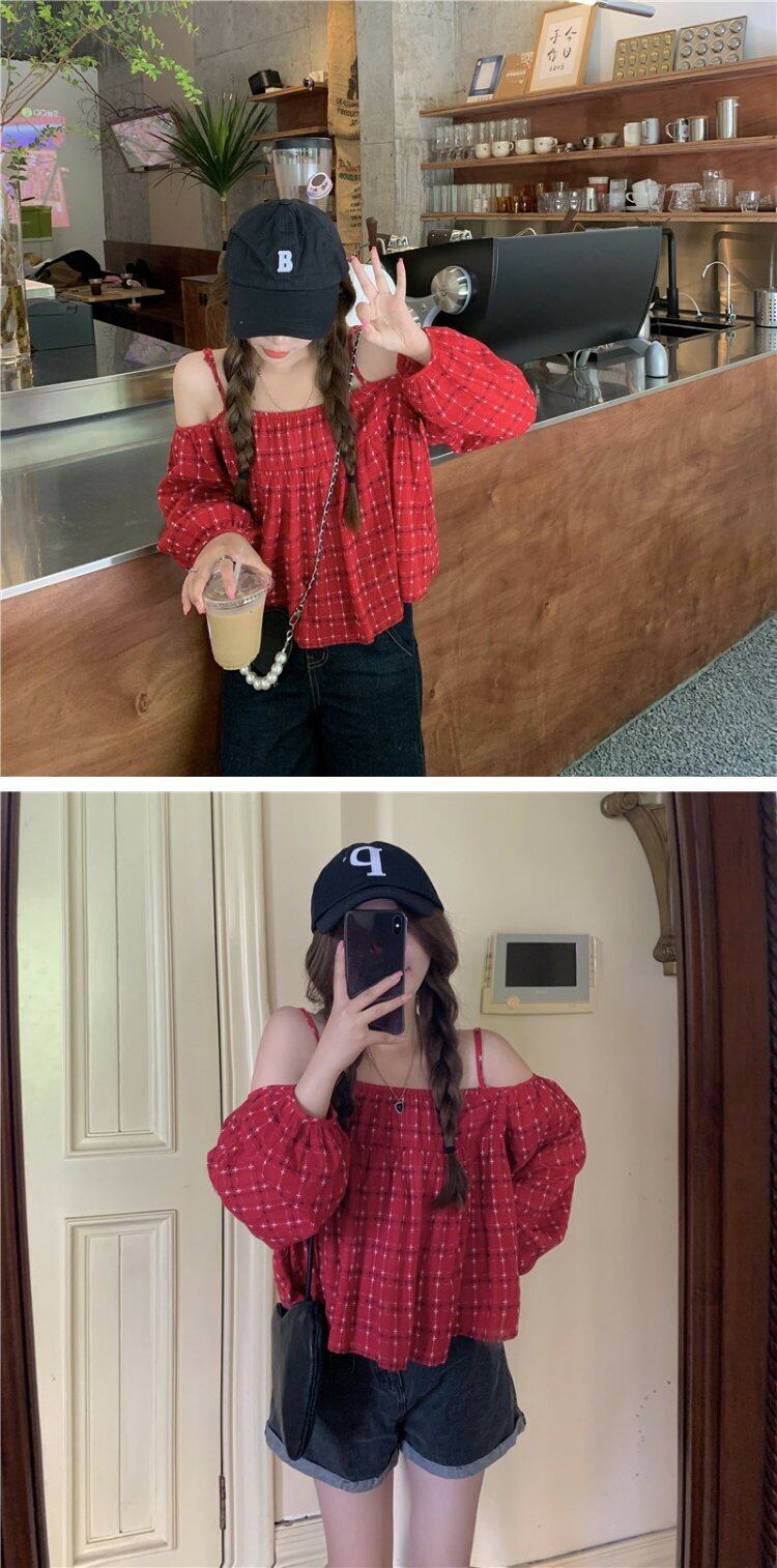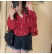格子柄トップス 夏服スタンダードシャツ レッド レトロ 刺繍 夏物 オフショルダー コーデ marchs6752439422202
